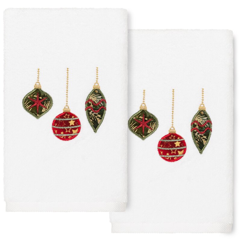 Bring a joyous Christmas spirit to your decorations with this hand towel for your guest bath. This hand tower features 3 different patterned decorations, suspended by sparkling beaded chains, which will add a merry mood to your festivities. This special and luxurious Christmas terry hand towel is manufactured with the finest Turkish cotton fiber for maximum softness and absorbency.