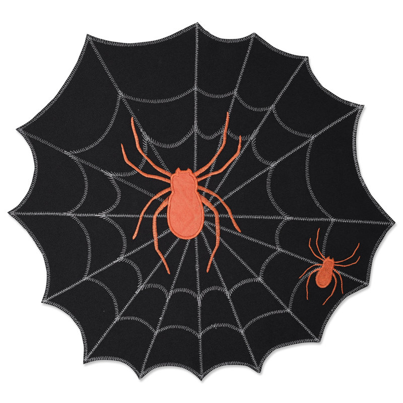 Set the mood this Halloween and bring a little spooky style to your tablescape with this creepy-crawly, set of two Spider Web placemats. Skillfully crafted in Halloween hues of orange, black, and metallic silver, each placemat is appliqued and embroidered, which gives dimensionality and dramatic appeal for any seasonal home.