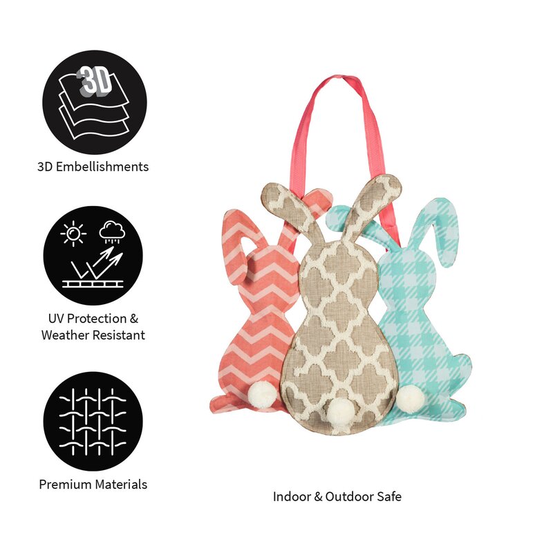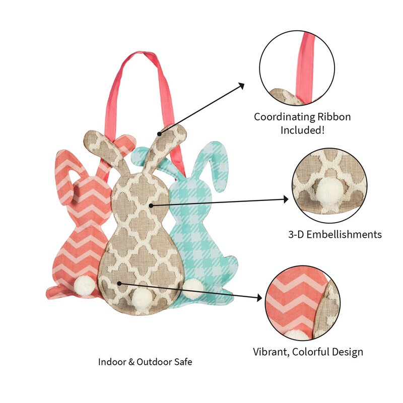 This poly burlap door decor is shaped like three bunny rabbits. Each rabbit has a white pom tail. 1) pink chevron 2) beige quatrefoil 3) plaid blue. It has a pink grosgrain ribbon for easy hanging. Perfect for Easter.