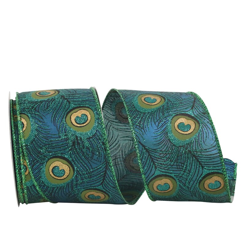 Ribbon Peacock Feather 2 Wired EdgeWiredColor : TEAL Size : 2-1/2 inch X 10 YARDSFiber Content : 60% Polyester 40% NylonRibbon Peacock Feather 2 Wired Edge, TEAL ; Your creations will be as pretty as a peacock with this glitter printed ribbon! Use it to add wonderful color to themed parties, gift wrap, floral arrangements and more. The perfect embellishment for craft & DIY projects. Wired edges for easy bow making.