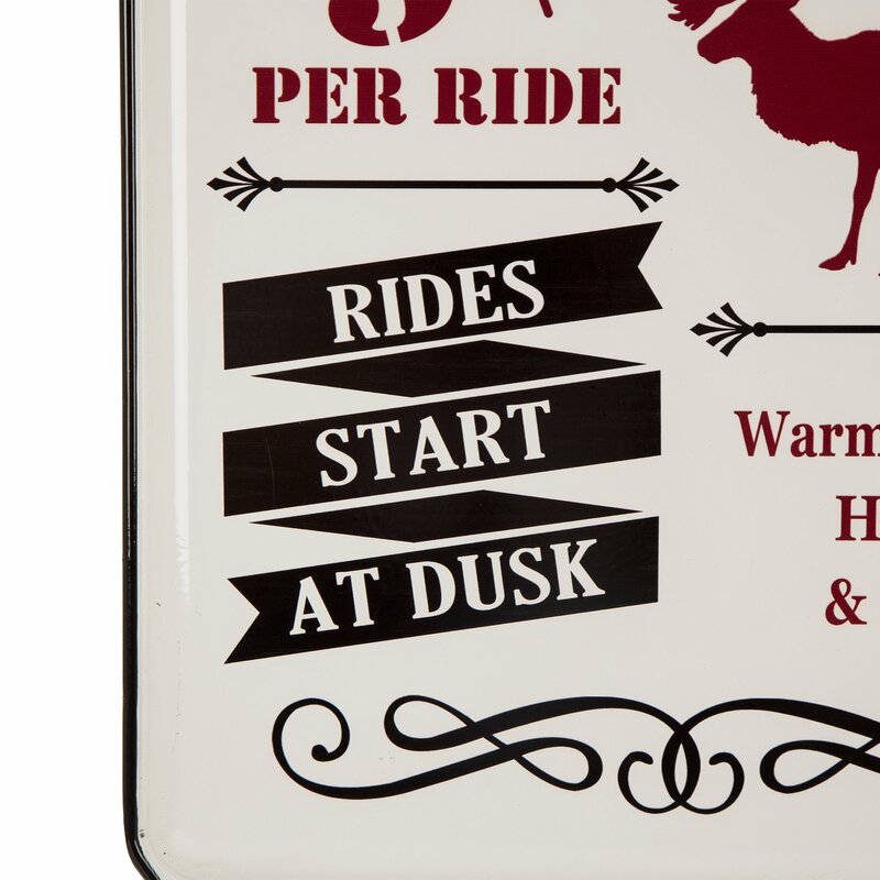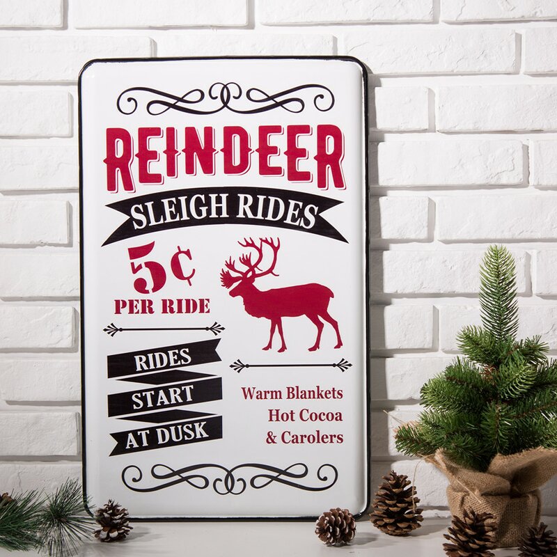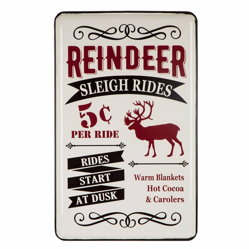 Crafted from iron, this rectangular wall decor helps round out your holiday decor with an eye-catching and whimsical focal point. Showcasing an advertisement for reindeer sleigh rides, this fun piece features hues of red, white, and black, so it easily blends with your Christmas ensemble. Best of all, this handmade piece arrives with wall mounting hardware included, so it’s ready to go up on your wall right when it arrives.