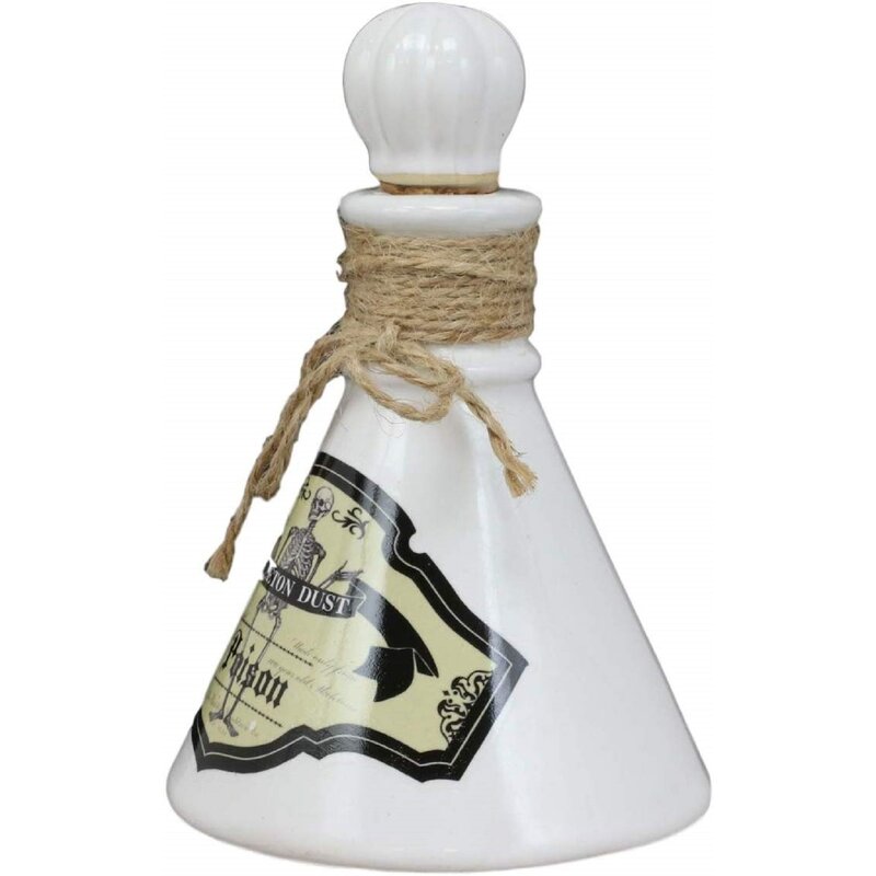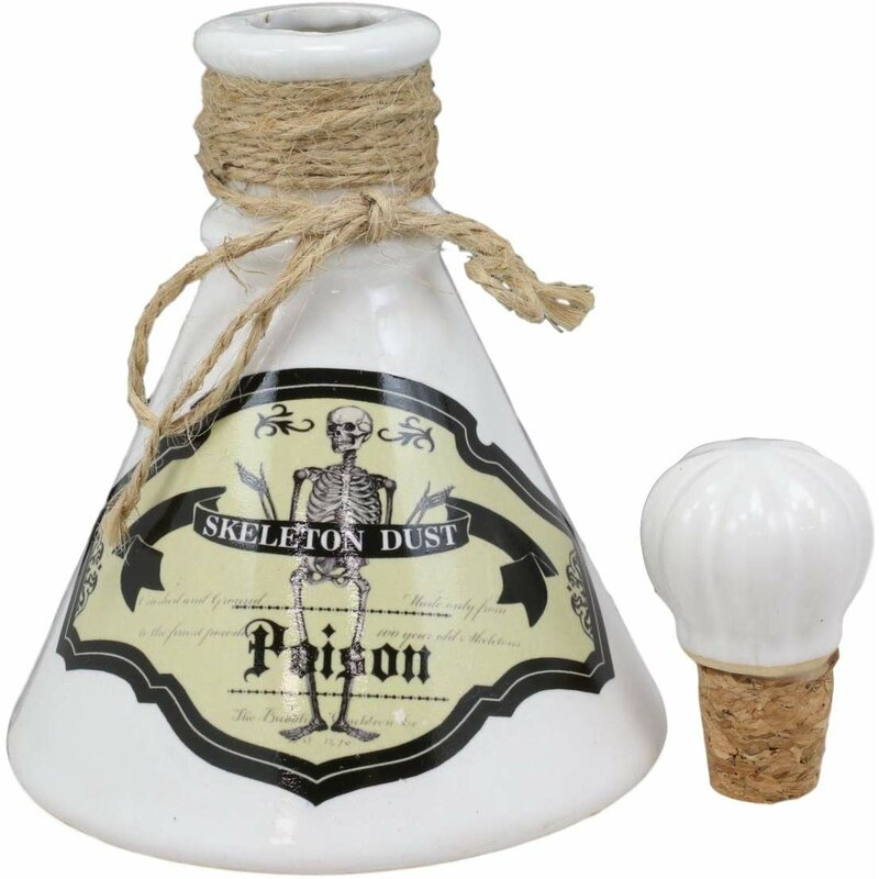 This unusual bottle looks as though it has just been taken from an apothecary. Predominantly white a ghastly skeleton in the center. This poison bottle is the perfect prop for your Halloween party or dark alchemy, witchcraft, mad scientist doctor themed events. The bottle is decorated with jute strings near the opening and a cork lid seals the bottle at the top.