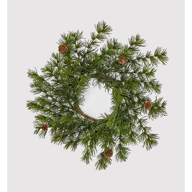 Give your Holiday décor a hint of the outdoors with this pine ring. It features realistic pine needles and real pine cones. Can be used as a centerpiece, decorate the kitchen or simply be creative and adorn any room.
