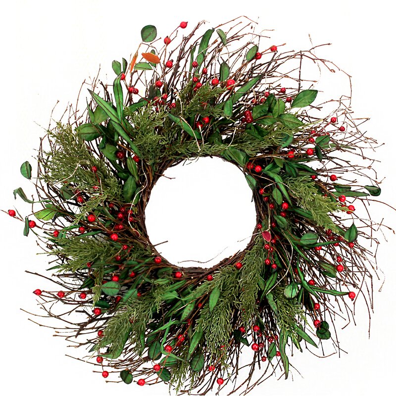 Great winter and everyday wreath. It features a cluster of red berries, mixed winter leaves, and sits on a twig wreath base. This wreath is great for your front door (cover and shaded), backdoor, or use as a centerpiece.
