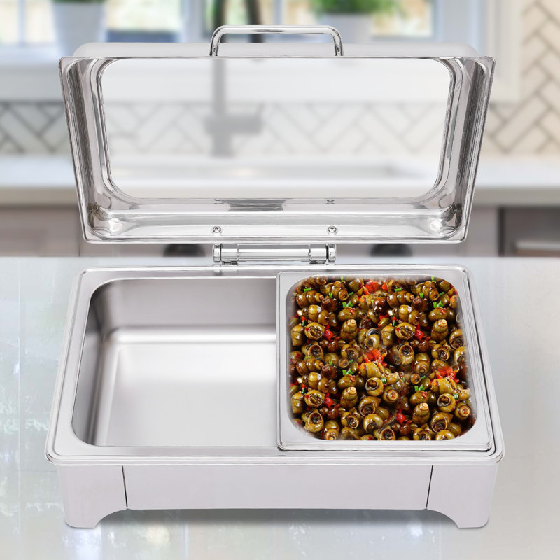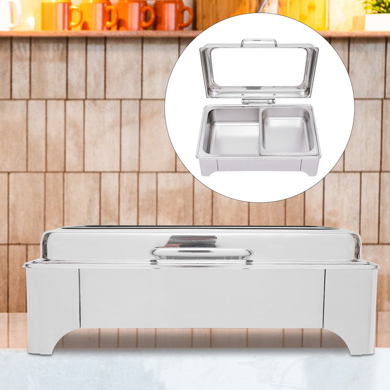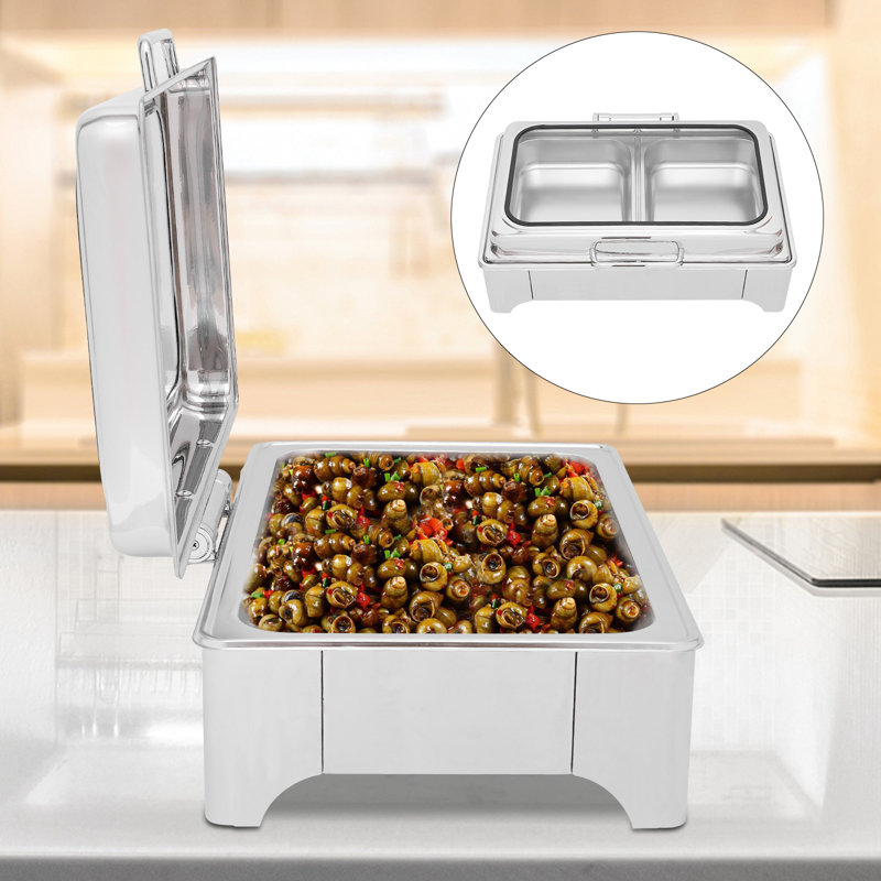 The buffet chafing dish warmer is made of high-quality 201 stainless steel, which is very strong, durable, and corrosion resistant. The two deepened and enlarged rectangular pans of the buffet chafing dish warmer provide you with about 9.5 quarts of capacity, which can meet the needs of parties or hotels.
