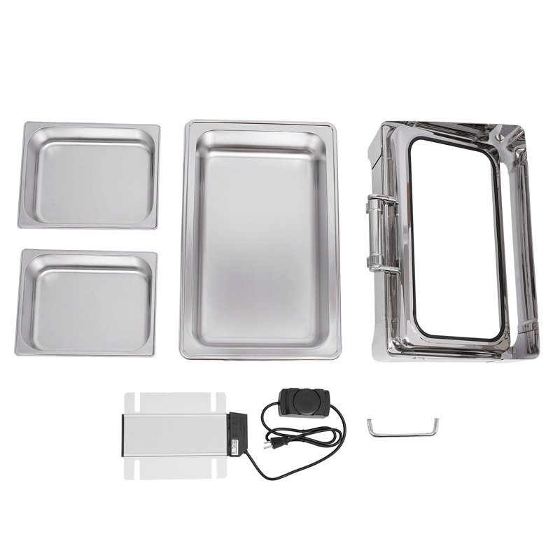 Shape: Rectangle; Process: Polishing; Power: 400W; Voltage: 110V/60HZ; Heating Method: Electric Heat; Adjustable Temperature Range: 35-80℃; Total Capacity: 9L/9.5Qt; Number of Trays: 2. Package Includes: 1* Buffet Chafing Dish Warmer, 1*Water Pan, 2*Trays, 1*Aluminum Alloy Heater, 1*Handle.