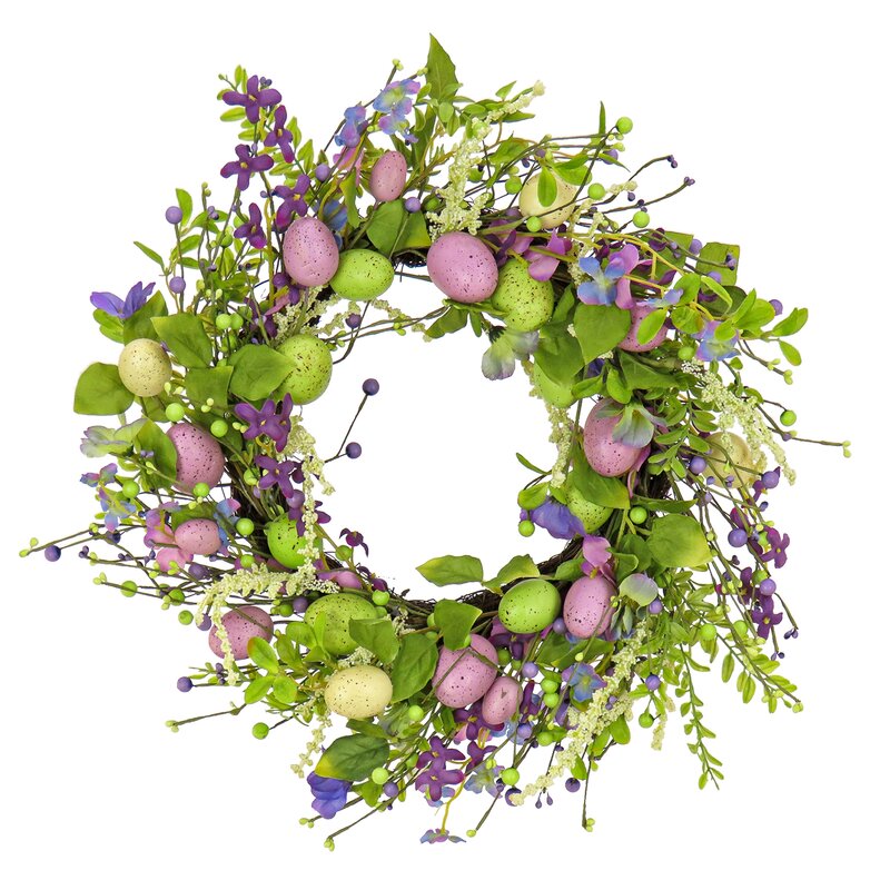 Welcome, Easter and the spring season with this bright, cheerful wreath. Handcrafted from polyester, this wreath features pastel-colored eggs on a thick woven branch ring trimmed with miniature flowers, leafy greens, branch sprigs, and berry clusters. Bendable stems make it easy to fluff up, while the durable fade-resistant design is made for use year after year. This wreath is also treated with a fire retardant for added safety. Best of all, it’s offered in a variety of colors to help you get just the right look.