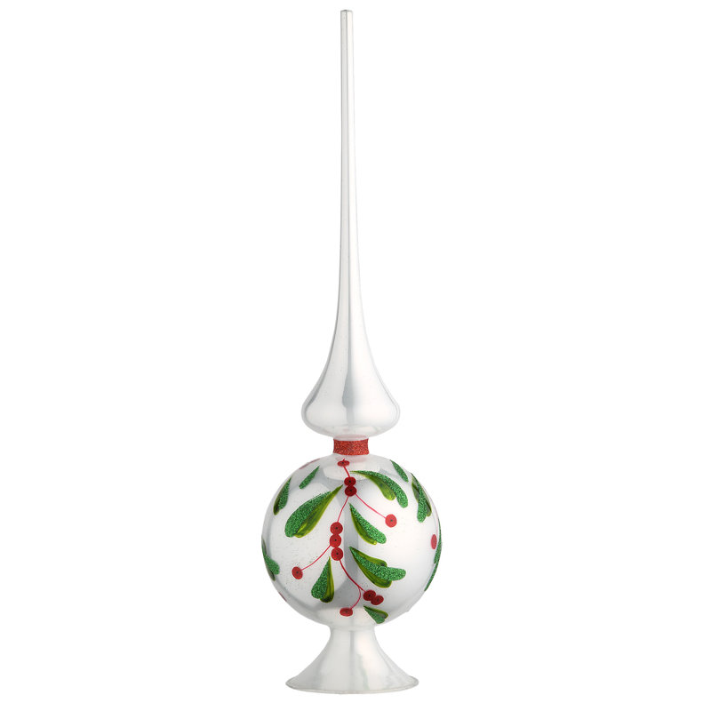 This blown glass Christmas tree top ornament features the classic ball and spire styling designed to complete your tree decorating with an artistic and elegant flare. A motif of green holly leaves and red berries is hand-painted on the ball of this treetop decoration with a bright white gloss finish. This tree finial is sure to become a treasured holiday heirloom ornament for many years to come. This blown glass Christmas tree top ornament features the classic ball and spire styling designed to complete your tree decorating with an artistic and elegant flare. A motif of green holly leaves and red berries is hand-painted on the ball of this treetop decoration with a bright white gloss finish. This tree finial is sure to become a treasured holiday heirloom ornament for many years to come.