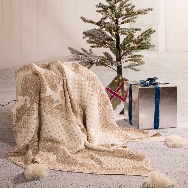 This knitted throw is colored in white and beige, white tassels on the four corners. Warm your home in the holiday spirit.