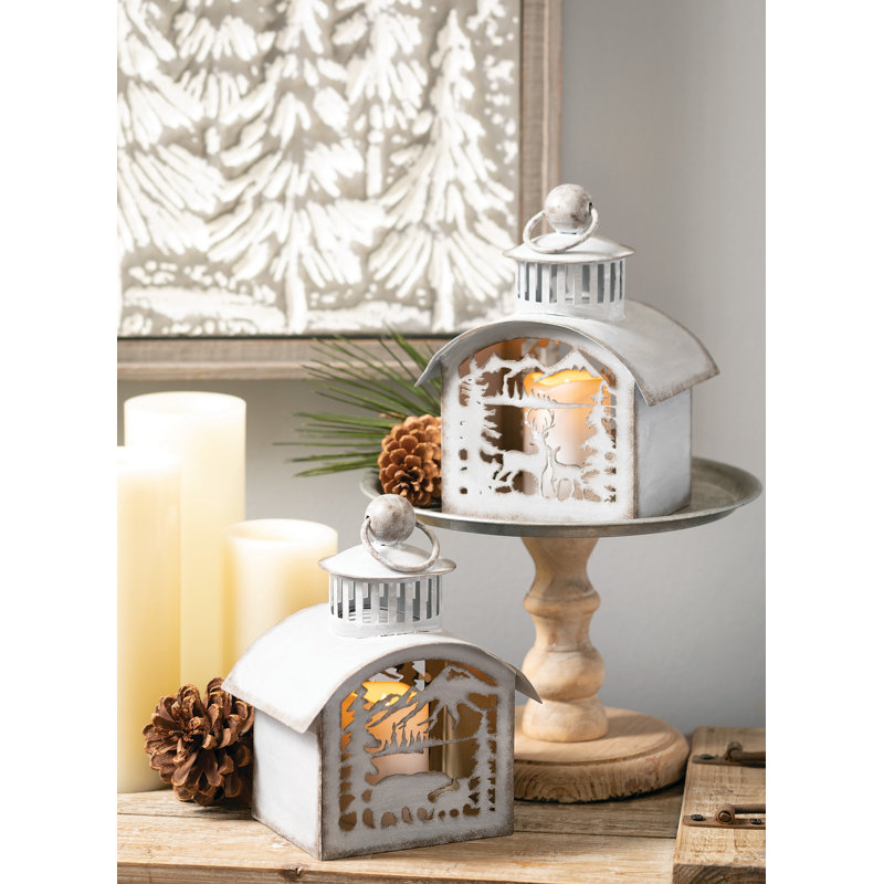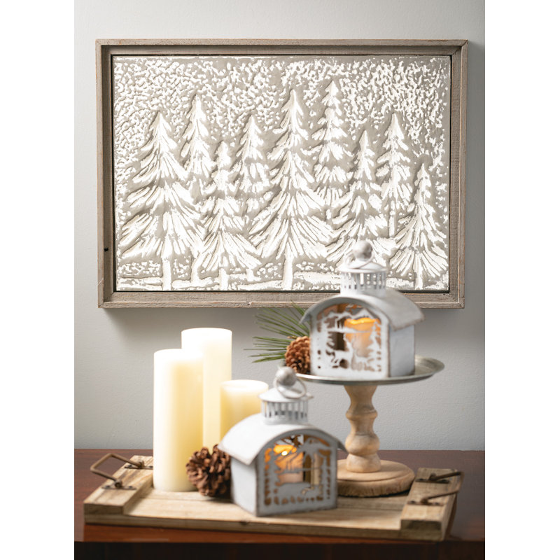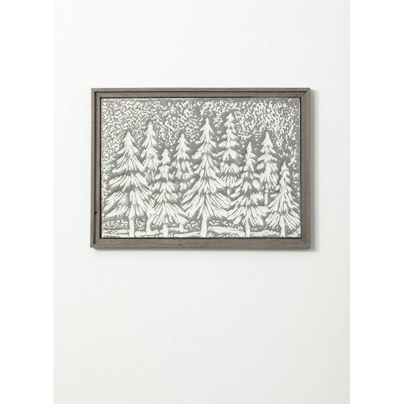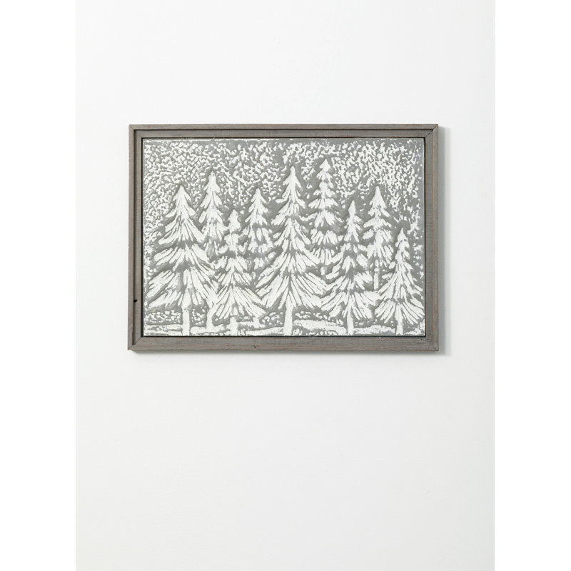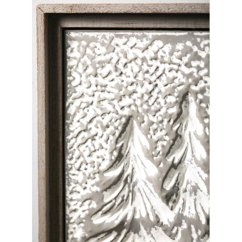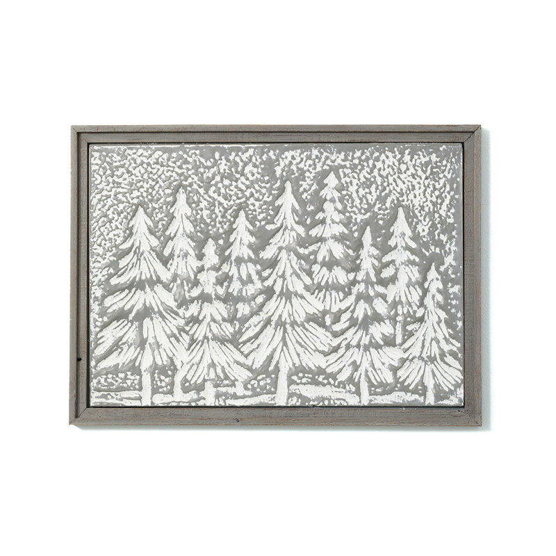 A simple fir wood frame surrounds this decorative iron canvas. This artistic piece of wall art features an embossed depiction of a grouping of evergreen trees, dusted with a white cast to better define the details.