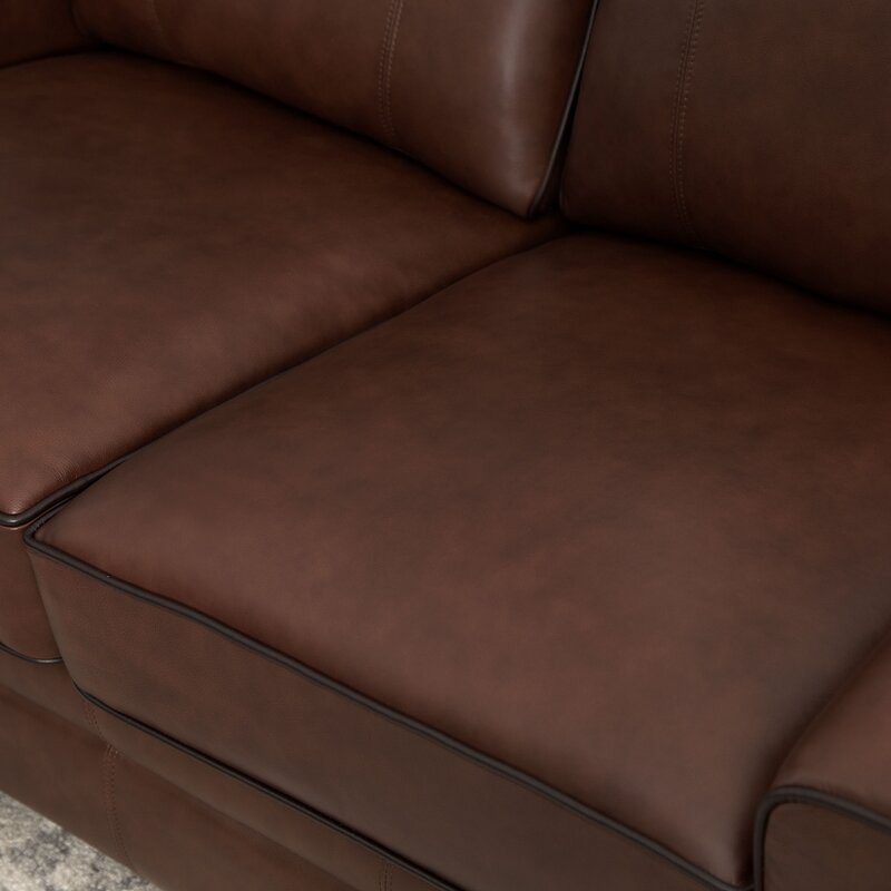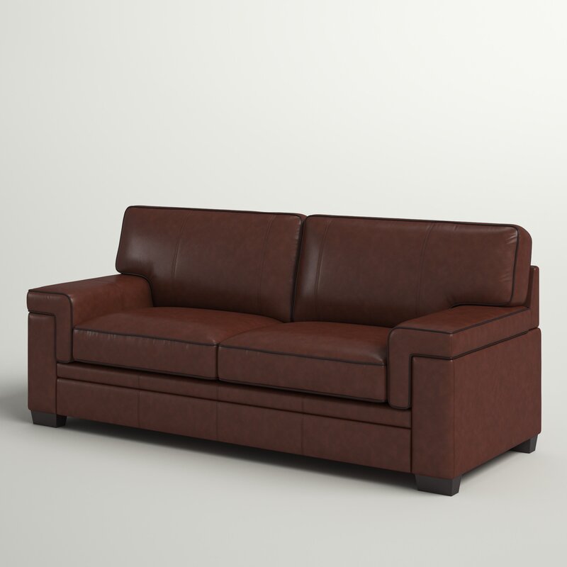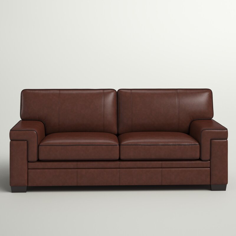 This sofa creates a classic look in your living room with its rich, genuine leather upholstery and clean-lined silhouette. It’s made with an engineered wood frame, and it features rolled arms and tapered block feet with an espresso hue. The cushions on this sofa are filled with foam for lots of support while you read or watch your favorite film, while the sinuous springs give you the right amount of bounce back. Plus, the back cushions are removable, so it’s easy to clean up loose crumbs or find that lost remote. To care for this sofa, we recommend leather conditioners every few months to keep it looking good.