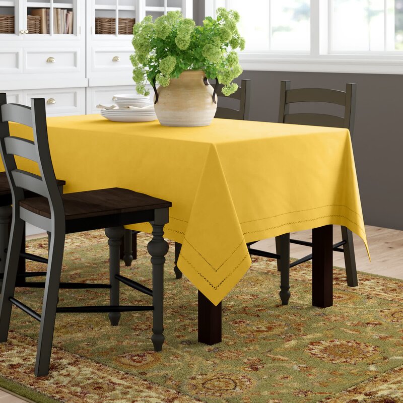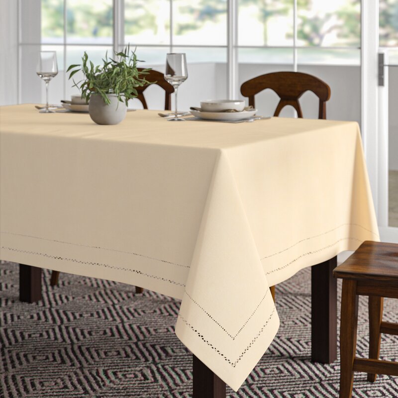 Deck out your dining table in chic style with this versatile tablecloth, the ideal piece for traditional and contemporary spaces alike. Though its solid hue may seem understated at first glance, this piece features a double border with perforated accents for a decorative, airy feel. It’s handmade from polyester in your choice of color, and it has a lightweight design that doesn’t overwhelm your dining room or kitchen table. Plus, this tablecloth is safe to toss in the washing machine and dryer for easy upkeep after any occasion, so you won’t have to worry about messy meals.