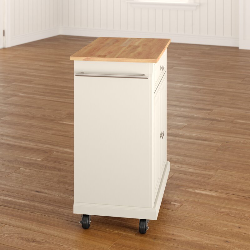 This kitchen cart optimizes your meal prep area with its clean-lined rectangular surface and interior storage. It’s made from solid and engineered wood with a sleek, neutral finish, and it rests on four lockable caster wheels for easy movement to the stove or the center of your room. An upper drawer and a lower cabinet with double doors feature raised paneling and metal hardware, while within is ample space for utensils and appliances. A butcher block-style countertop and a pair of towel bars complete this traditional design.