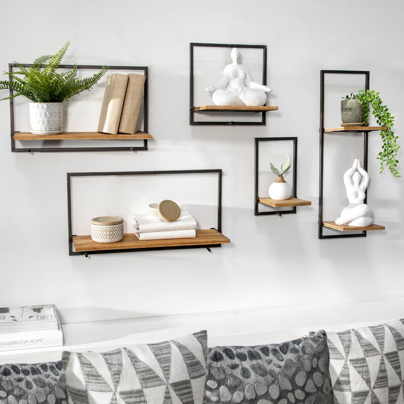 This 5-piece accent shelf set transforms an empty wall into a sleek display space. It includes five pieces with six total shelves, each crafted from engineered wood in a light finish that highlights the natural wood grain color and pattern variation. The matching geometric design features a shelf surface surrounded by a metal outline – so each plant or decor item looks like it’s in a modern, openwork picture frame. We love that this shelf set comes with mounting hardware, so they’re ready to hang and style right out of the box.