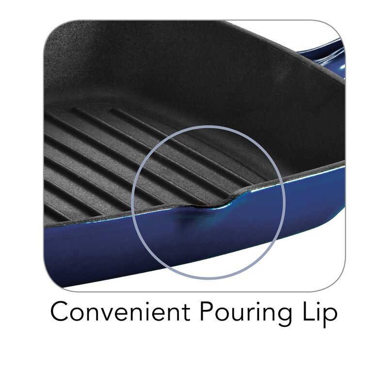 Redefine your cooking experience with the griddle pan. This grill pan features a colored, porcelain enamel finish, which makes it ideal for cooking and serving purposes. It includes a heat-safe helper handle and two pouring handles. This square-shaped grill pan is equipped with a press with a stainless steel knob. The grill pan is ideal for frying and baking. The sturdy cast iron construction of the grill pan ensures years of reliable use. You can toast bread, fry eggs, and bake fish, or meat on this grill pan. The black porcelain-coated interior evenly distributes heat to the food and perfectly cooks it. The ribbed design reduces the oil consumption in dishes and creates perfect grill marks. This grill pan is compatible with gas, electric, ceramic glass, and induction cooktops. It is also oven safe and can hold heating temperatures up to 450°F. The grill pan by Tramontina is available in multiple finishes giving you the option of choosing the one that is best suited to match your needs. It is easy to clean and maintain and can be hand washed as and when required.