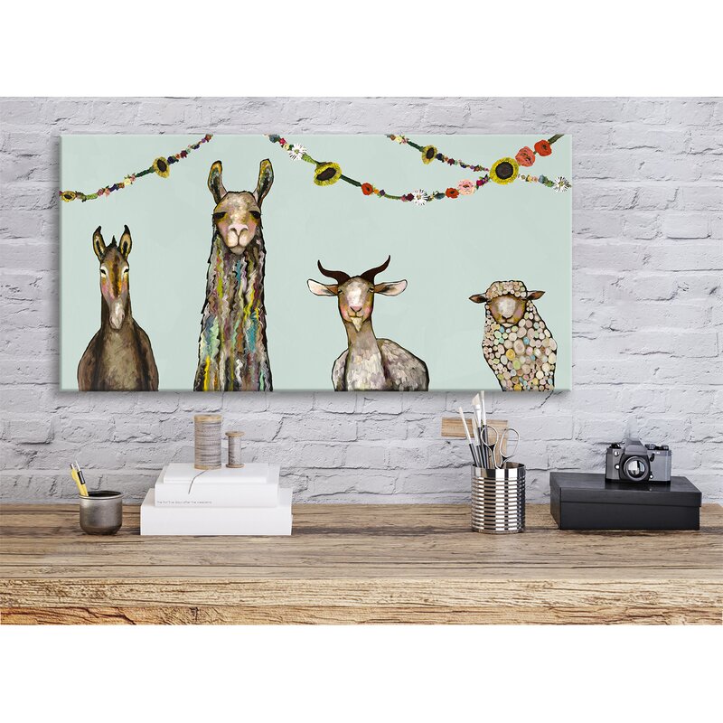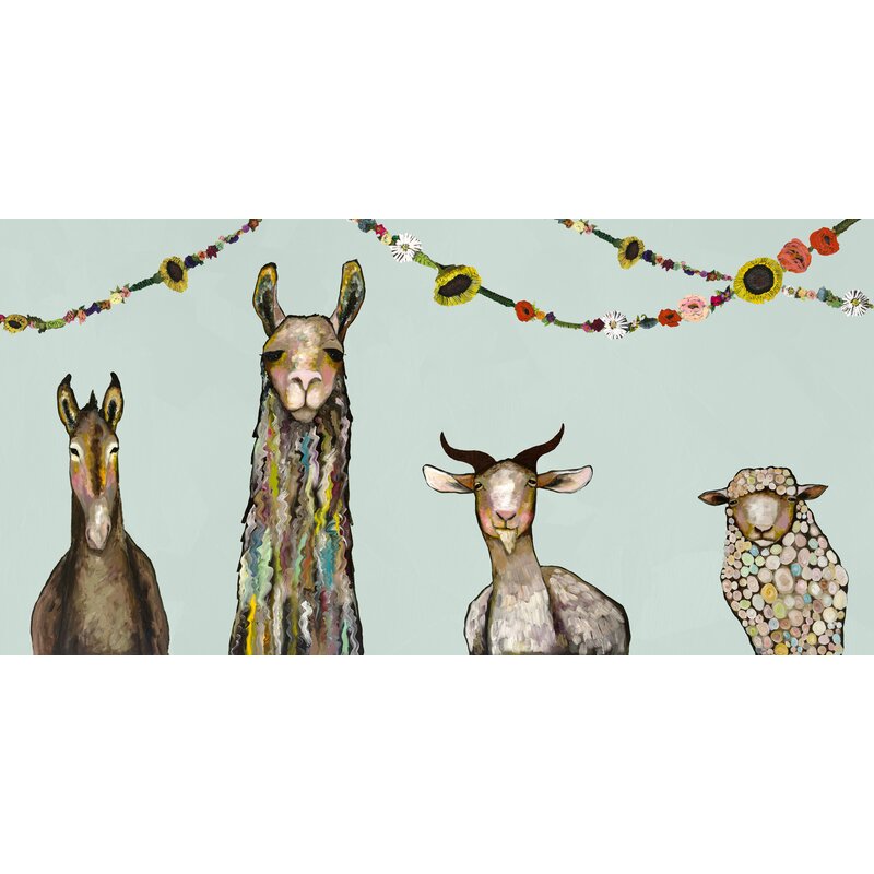 A small grouping of farm animals including a donkey, llama, goat, and sheep under a Christmas garland.