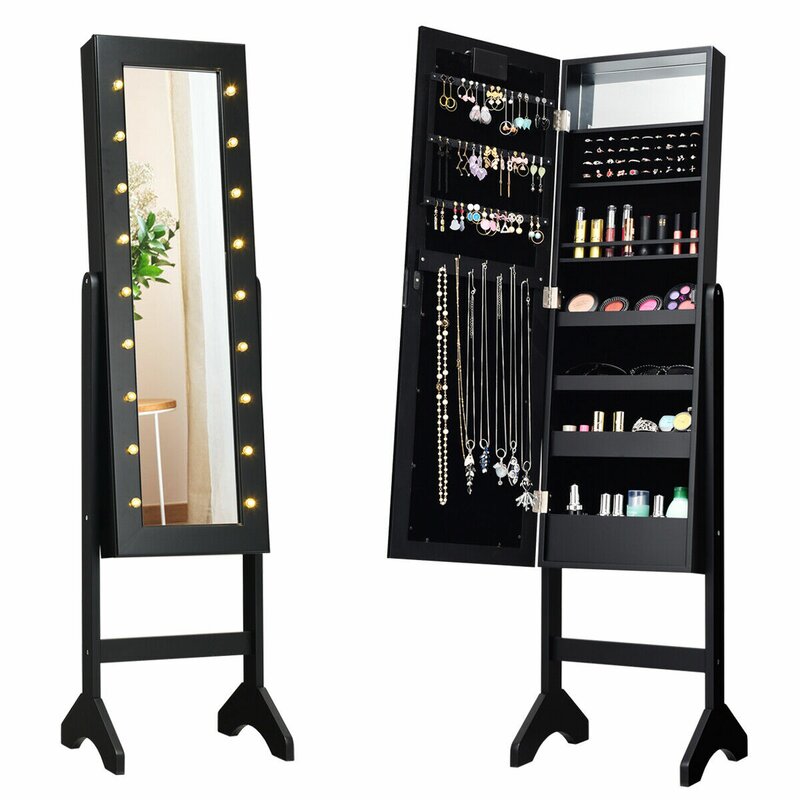 Let your teen get ready each day from the comfort of their room with this freestanding jewelry armoire, featuring a mirror on the front so you can grab a glimpse of your reflection. Crafted from manufactured wood in a neutral finish, it features an interior cabinet with hooks, shelves, and slots to organize necklaces, bracelets, and beyond. Best of all, 18 integrated LED lights adorn the front of this design to offer an essential boost of brightness. Partial assembly is required.