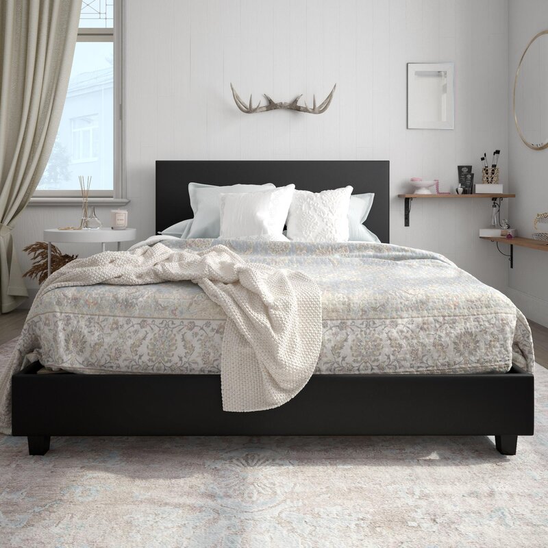 Keep it simple with the Hayley Upholstered Bed. Versatile and stylish, this bed frame can blend and enhance any bedroom décor with upholstery options that include faux leather, linen, or velvet. The tall rectangular headboard endows the bed with character and gives it an undeniable presence in the room. The modern design of the Hayley Upholstered Bed combined with its wooden legs provides a neat and clean look for your bedroom. Built with a strong metal and wood frame that includes metal side rails, a metal center rail, and an extra center leg, the Hayley Upholstered Bed is not going anywhere. No additional foundation or box spring is required as the bed frame comes with a bentwood slat support system that allows airflow for your mattress to stay fresher and longer. This versatile bed is offered in a variety of trendy colors and is available in Twin, Full, and Queen sizes.