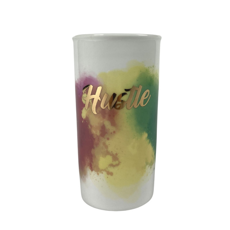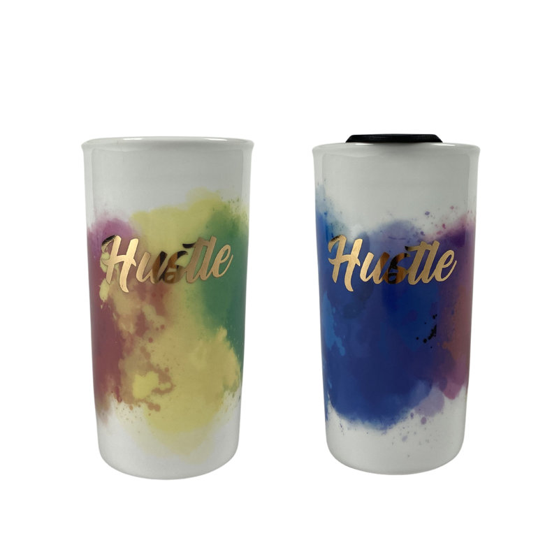 These travel mugs are high quality. Beautiful tye dye design the gold letters haven’t rubbed off from multiple uses. I drink both hot and cold drinks it controls the temperature just fine. The only con is there’s not grip.