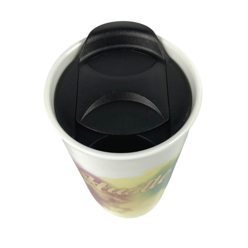 Double-walled ceramic mug with a slide-to-close plastic lid