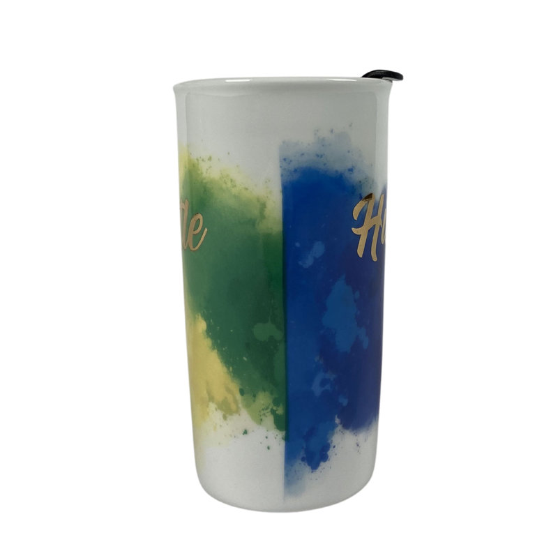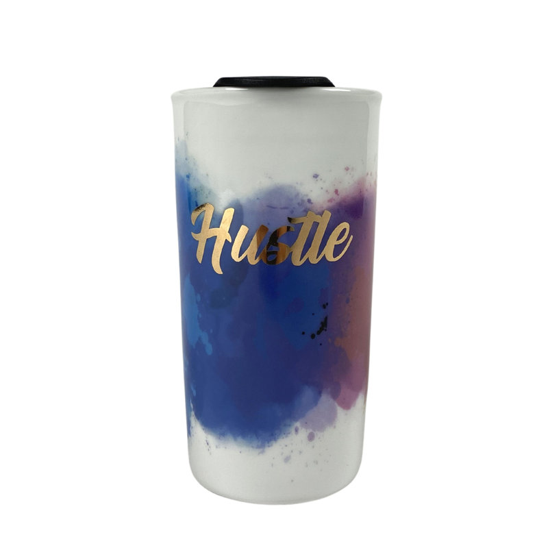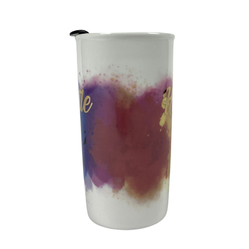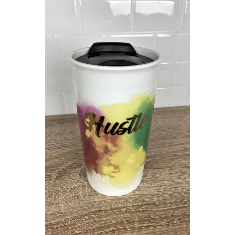 Suitable for hot and cold beverages. Reusable travel mug is made of durable ceramic and fits in regular size cup holders.