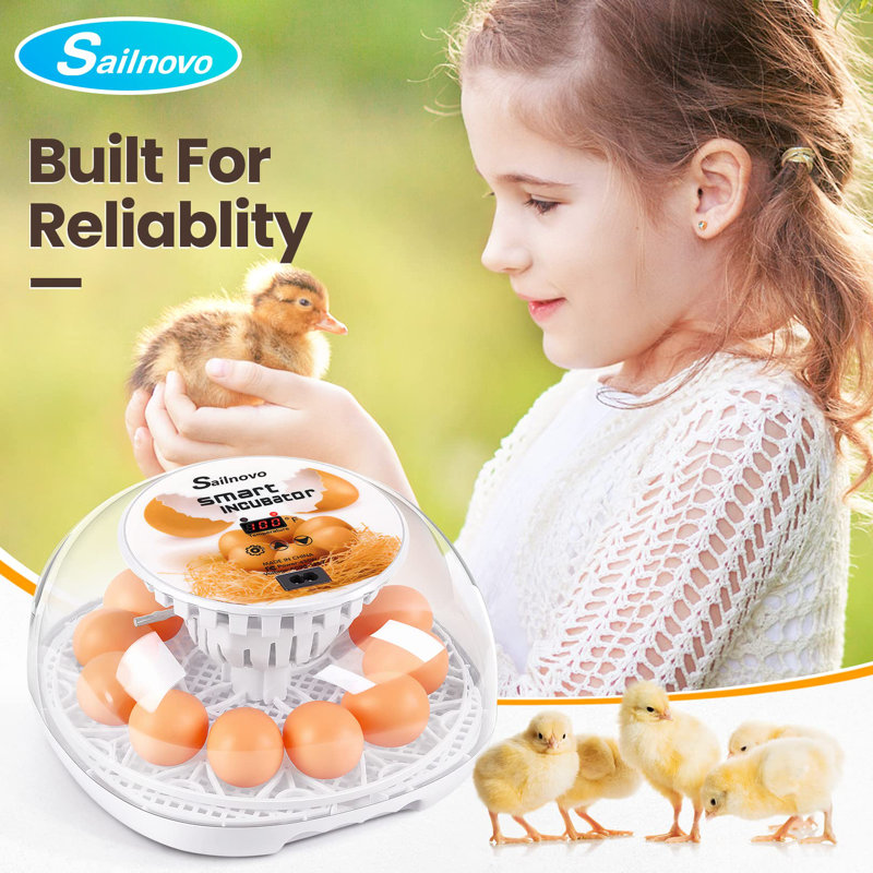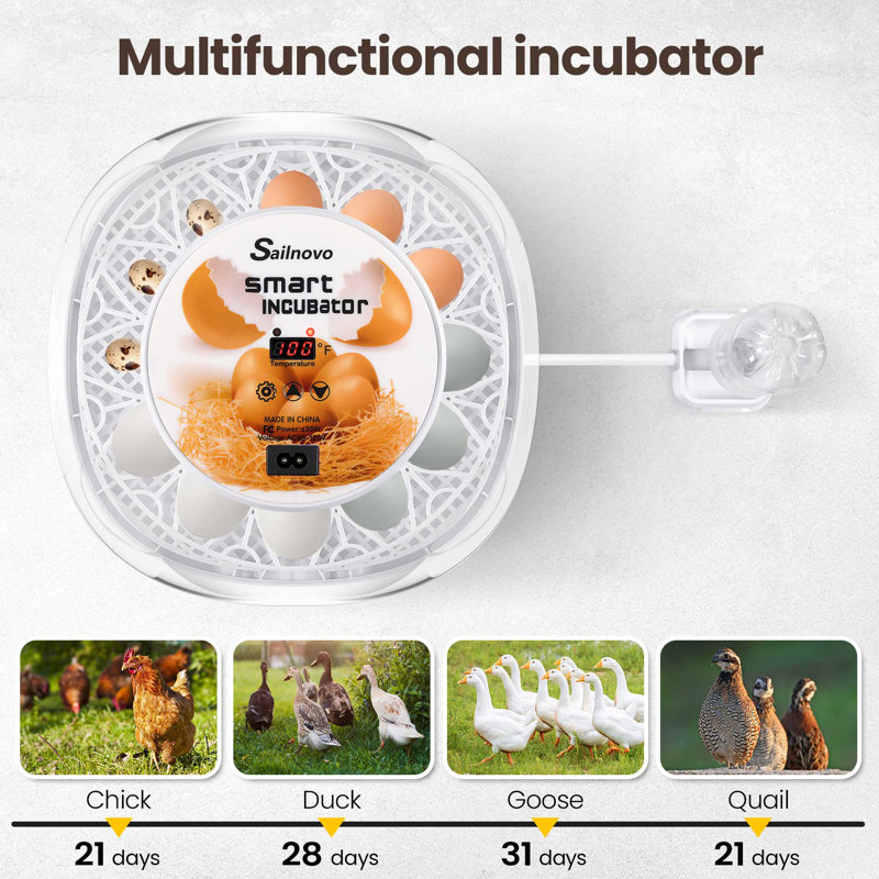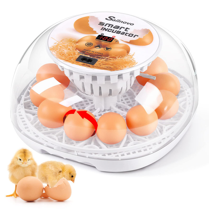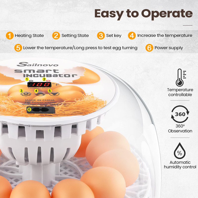 12-24 eggs 360 °fully transparent insulation cover to observe developmental changes in all directions. Egg incubator is easy to assemble and suitable for breeding a variety of eggs, 12 chick eggs, 9 duck eggs, 24 quail eggs, etc.
