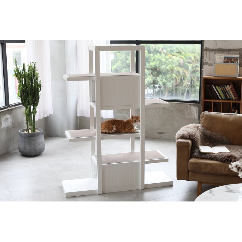 The bookshelf cat tree is a beautiful balance of modern style and feline fun. This cat tree has a total of six platforms with a variation of open and concealed play spaces. Shelves are covered in quality carpet that provides additional traction and a durable surface for scratching. Your cat is sure to enjoy this chic product for years to come.