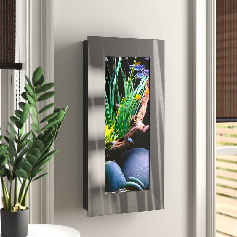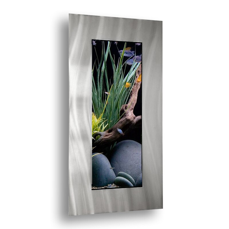Make your fish a focal point in your home with this wall-mounted aquarium tank, perfect for sprucing up a tall and narrow space on your wall. Brimming with a modern flair, this rectangular metal fixture features a clear glass freshwater tank that can hold 4 gallons of water. An included submersible filter helps your fish stay healthy and happy, while an LED light fixture shines a spotlight on them as they swim around. For even more function, mounting brackets, hardware, and fishnet are included.