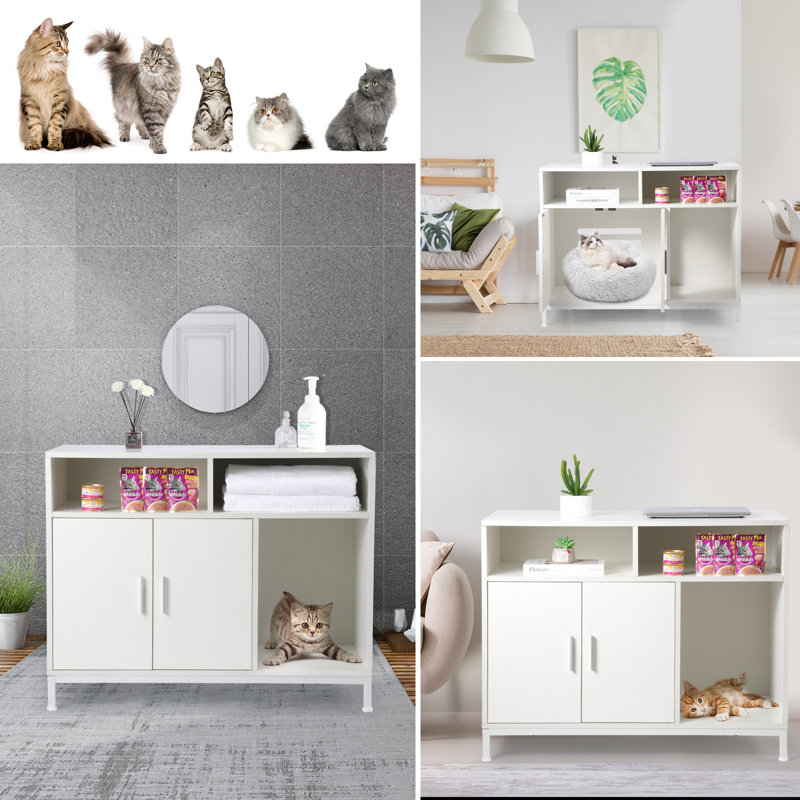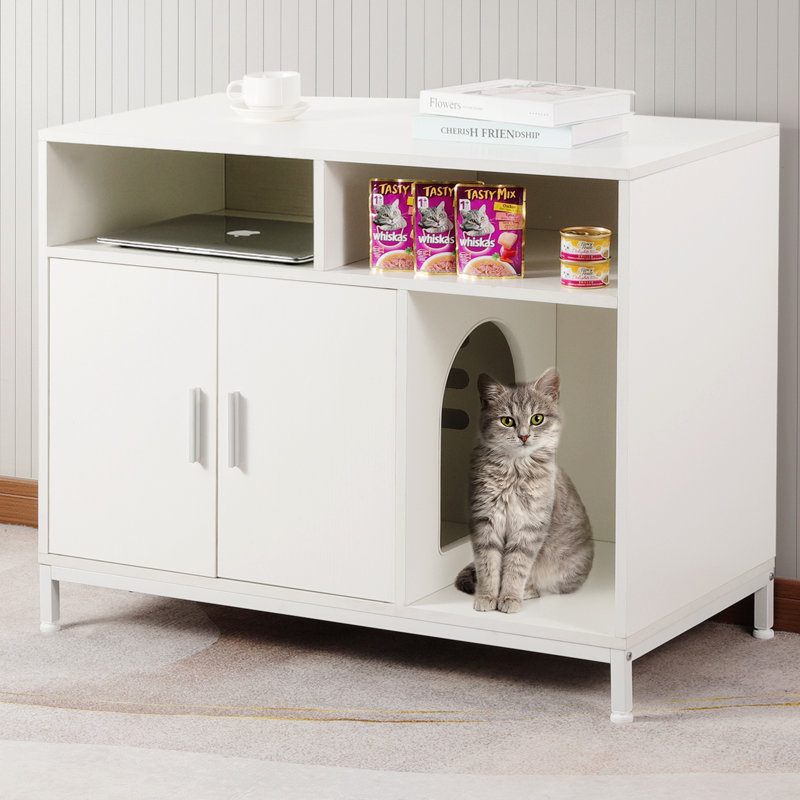 Why choose Tucker Murphy petâ„¢ litter box furniture? A cat litter box enclosure, which can avoid the mess, hide the smell, and give your cats a little privacy. Wide usage as a beautiful TV stand, side table, as well as cat house to hides your cat’s litter box or bed. Sturdy and durable: Made of particleboard and a steel frame, it’s wear- and scratch-resistant, strong, and durable. Easy to clean: 2 doors allow easy access to the litter box for litter scooping, tall legs make it easy to clean the space underneath. Easy assembly: Straightforward instructions help you assemble it within 30 mins. Works for you, too: The spacious top offers a nice perch for your lamp, books, and decorations.
