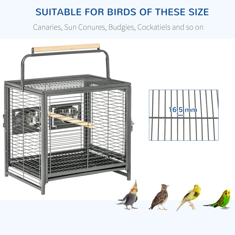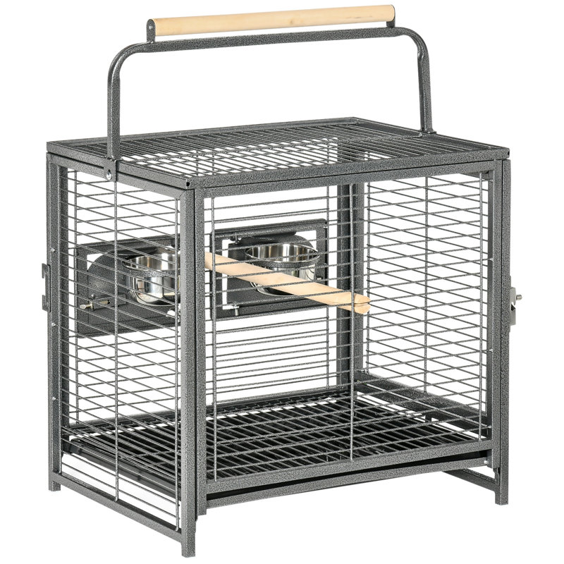 This portable bird cage for travel and emergencies has a lightweight design with a handle, which makes it easy to transport while keeping your feathered friend secure and comfortable. Features a slide-out tray for easy cleaning, feed doors with 2 stainless steel bowls for convenient feeding and wood perches for stand. Made of steel frame, this bird cage is tough enough to ensure daily use. Add the travel carrier, take along your lovely friend and start your wonderful journey!