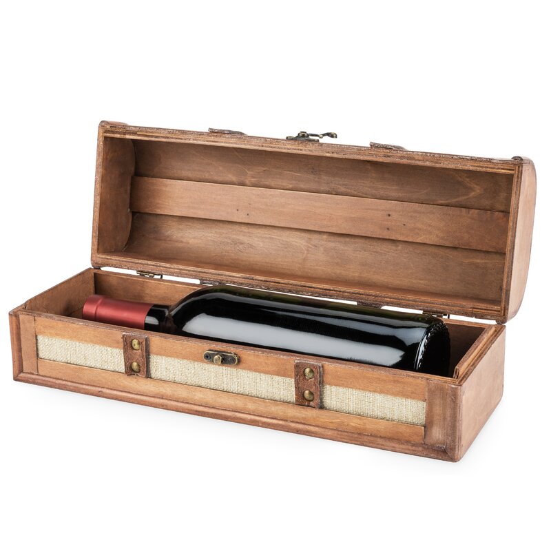 With an aged wood finish, brass accents, luggage straps, and a design reminiscent of an antique trunk, this carrier will add a touch of vintage charm to any collection. Each box is designed to accommodate 2 standard wine bottles.