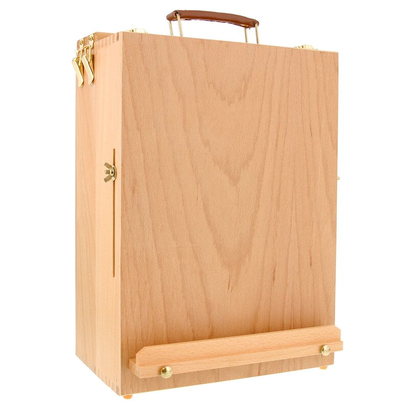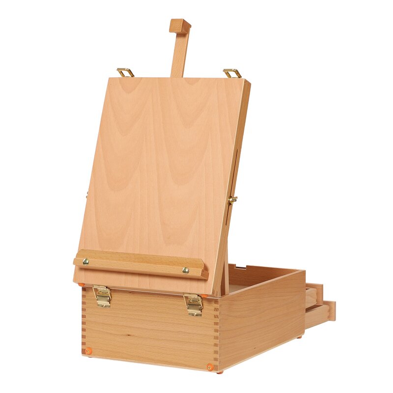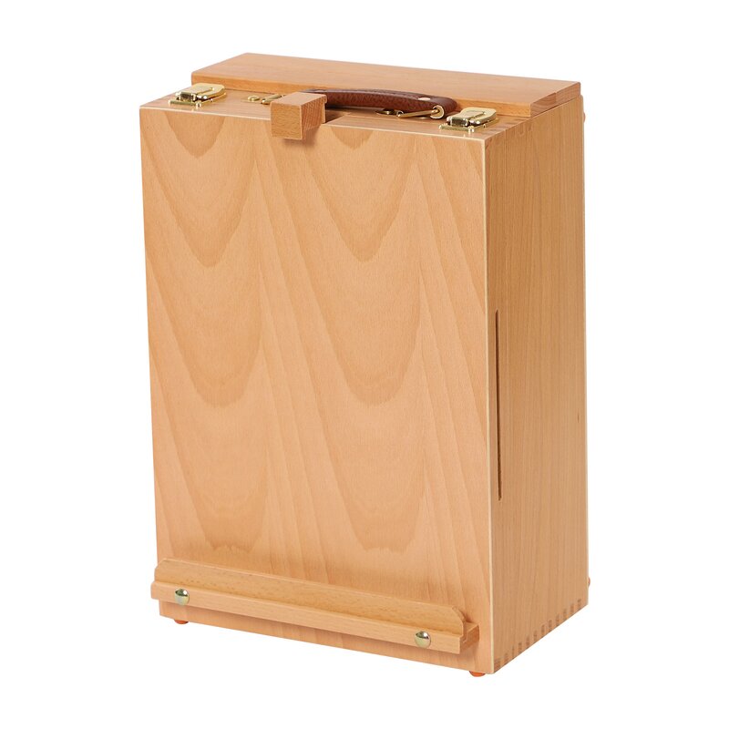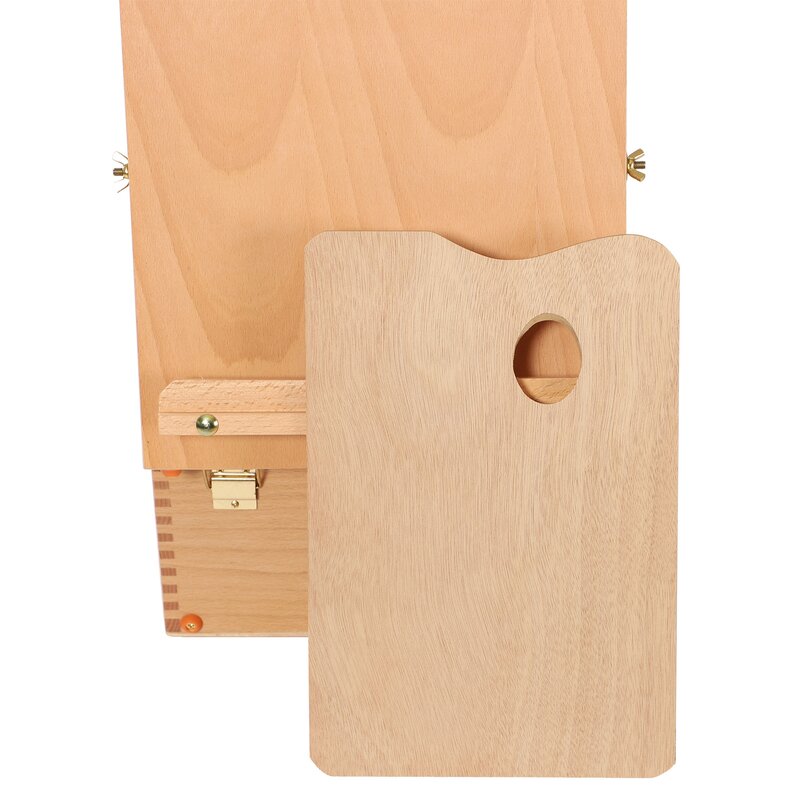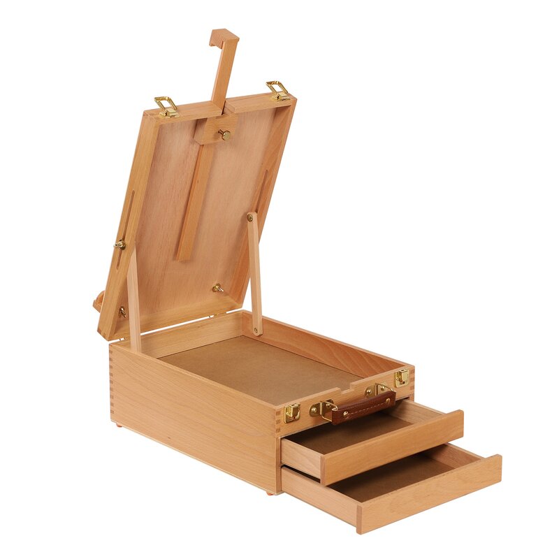 French easel design with a large interior storage box and two additional sliding drawers made of hand-sanded aged oil-finished beech wood and metal locking clasps multiple compartments and an artist’s wooden palette designed for easy portability with a durable handle folds to box size for storage into a small space and for transporting.