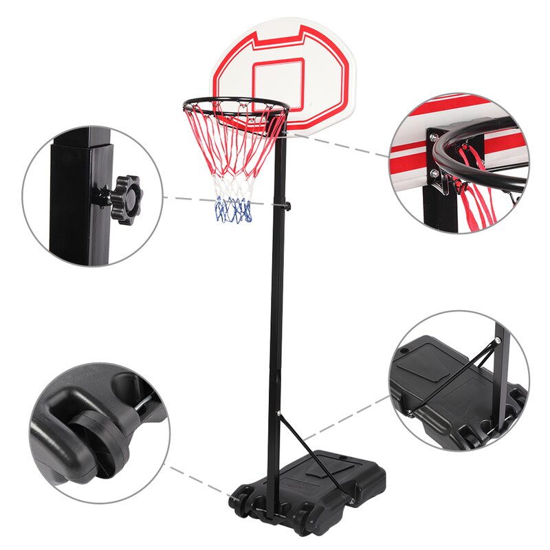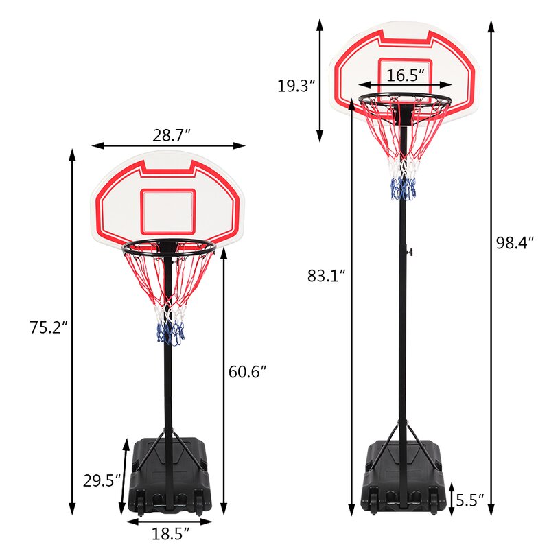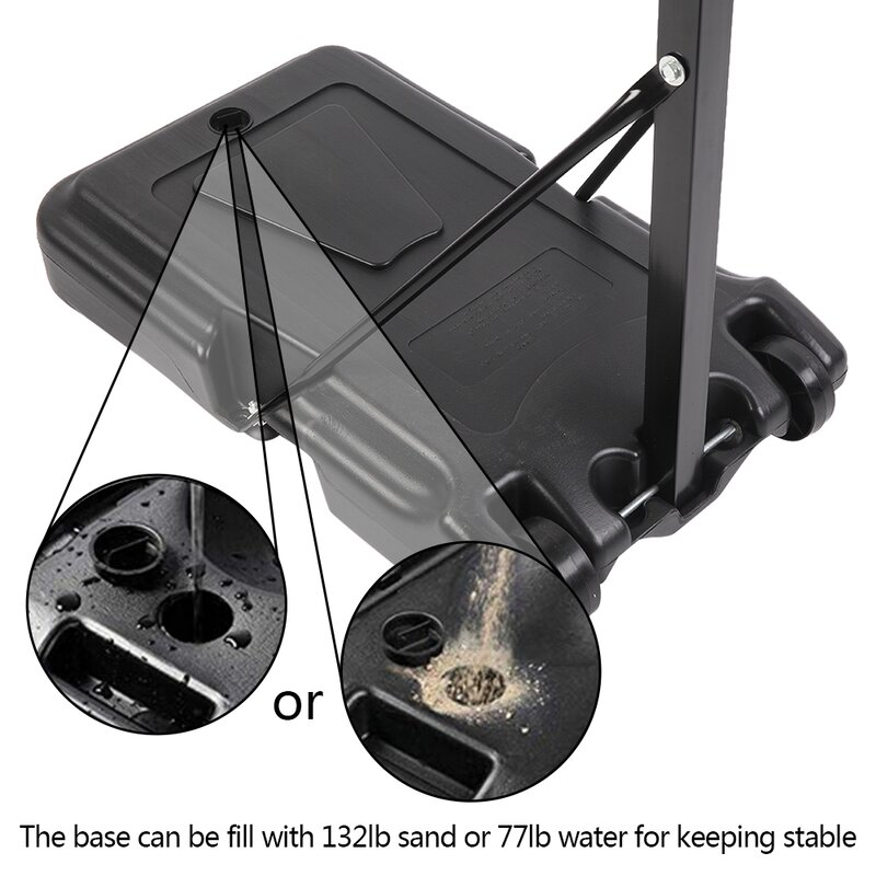 Great for kids, juniors, and youth at 5-12 years for full enjoyment of playing. Durable and utility impact backboard made of shatterproof clear polyethylene panel, the rim is constructed of 16 mm steel and an all-weather nylon net, coated with corrosion-resistant spraying paint, rust, and weather-resistant, designed to withstand the harshest elements, tough enough for the most competitive games. Ultra stability large PE molded base can be filled with water or sand to increase stability; so your kid can jam with the confidence that their hoop will stay standing. The basketball hoop system will give you an authentic basketball experience. Mobility and convenience bottom configure pulleys, contain 2 heavy-duty wheels to ensure easy maneuverability, just need to tilt the basketball stand forward, and easily move it, convenient, anytime, anywhere! Will ensure hours of fun for all basketball enthusiasts. Easy to assemble. You don’t need the other tools to assemble the basketball goal stand.