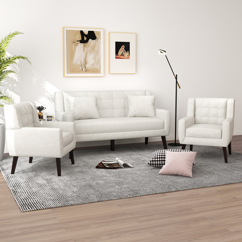 The cushion and backrest of this armchair are made of high-density and high-resilient native foam, which can provide maximum comfort for you. Soft linen fabric foam padded cushions with enough width and depth to give you hours of comfortable sitting without sacrificing fashion and style. The armrests and frame are made of solid wood, there is no peculiar smell, and no color difference and the accent chairs for the living room are so sturdy that can hold up to 440 pounds (static load capacity). This mid-century modern couch lights up your whole home with modern craftsmanship and classic aesthetics. Stylish tufted linen upholstery with a mid-century low-profile design, adding more features to your living room. If you require a perfect small space solution for your home or stylish and functional furniture for your apartment, our love-seat are the perfect choice for your needs. This loveseat sofa will be a favorite spot for leisure in your home. It is 62.97 inches wide and spacious enough for 2 people.