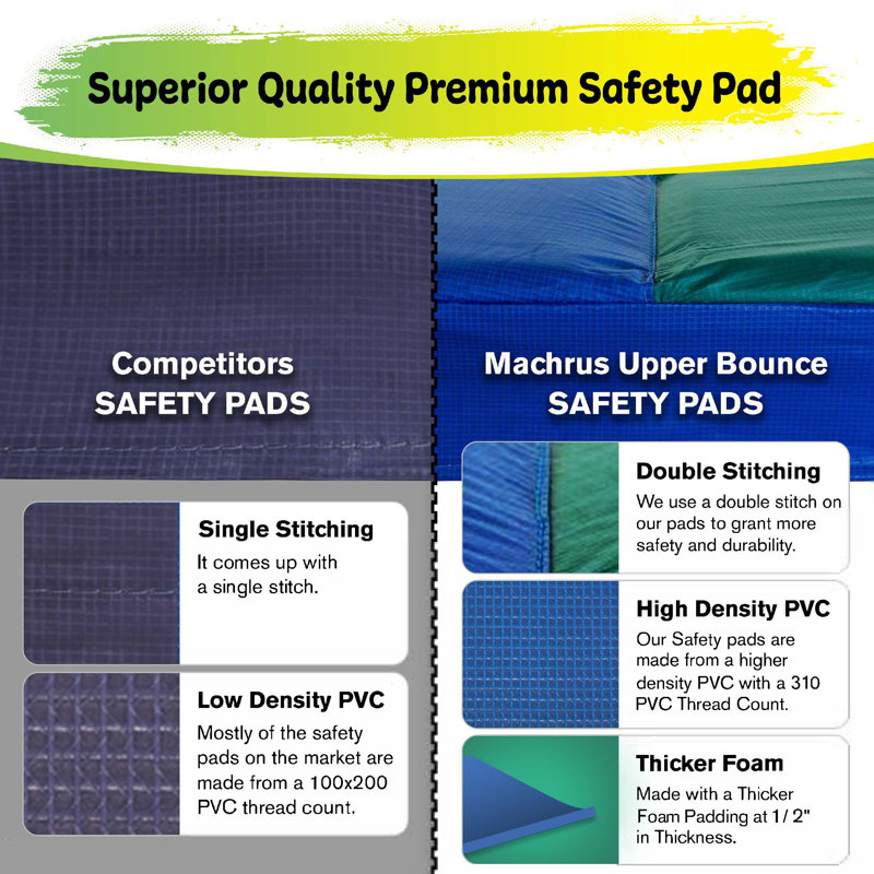 Bring bouncing fun to your backyard with the Machrus Upper Bounce trampoline spring cover. This replacement pad ONLY fits for our Upper Bounce brand 9×15′ Trampoline (Item # UBRTG01-915 & UB03EC-915E). Our superior quality premium PP mesh trampoline safety pad is tested to be UV and water-resistant. Offering you a safe and long-lasting fun investment. Machrus’ Upper Bounce Trampoline Safety Pad is a must to have to ensure your families safety. Our Trampoline Spring Cover ensures that you and your family do not get pinches and scrapes. Machrus Upper Bounce Trampoline Safety Pad protects the jumper from falling on the steel frame or getting hurt from the springs. You will enjoy many years of safe fun on your new trampoline with no worries at all. Safety PadS 1/2″ foam thickness EPE ensures absolute safety for your children. You can now combine loads of fun with loads of health benefits. Machrus’ Upper Bounce trampoline spring cover provides tremendous safety during jumping for a controlled and responsive jumping experience. Let’s go out and play!