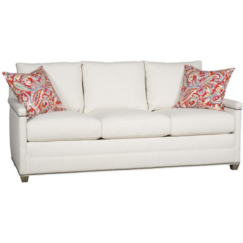 The sofa is part of the American Bungalow collection. This collection brings out your inner interior designer to create custom upholstery that reflects your unique personal sense of style and comfort. This sofa features three seat cushions, 8-way hand-tied construction, a maple frame, and nailhead detailing. Two throw pillows and a queen mattress are included.
