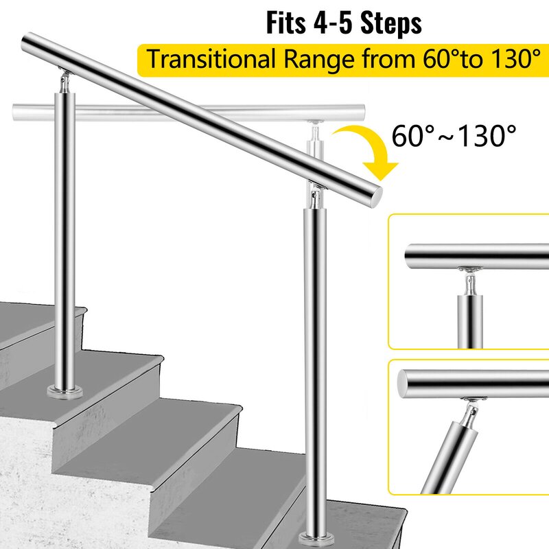 Suits 4-5 steps design distance between vertical bars; the stair handrail fits 4 to 5 steps with pipe stoppers. Two spherical joints are designed with 60 to 130° transitional angles. You can adjust the desired location to meet your different needs.
