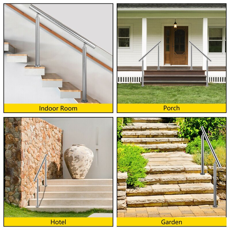Outdoor & Indoor Uses: the outdoor stair railing is crafted with a modern style and ergonomic design, which is perfect for a porch, deck, patio, commercial office building, hotel, etc. It can be mounted on different floors like concrete, wood, ceramic, and marble ground to keep it stable.
