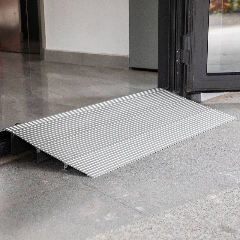 Transitions modular entry ramp -the transitions modular entry ramp for doorways is up to 800 lbs load capacity. All aluminum alloy construction, an extruded slip-proof surface, adjustable flap, and no-tool assemble for the stably and securely pass by wheelchairs, scooters, walkers, and crutch users.
