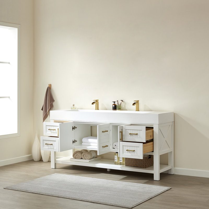 I purchased this vanity for a new construction house and needed something modern & stylish.This vanity is all of that!The cabinet is high quality & solidly made.The color white & gold are right on trend – very stylish.This vanity is a definite statement piece in any bathroom.I’m very pleased with this cabinet!