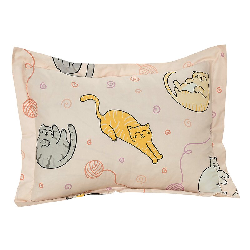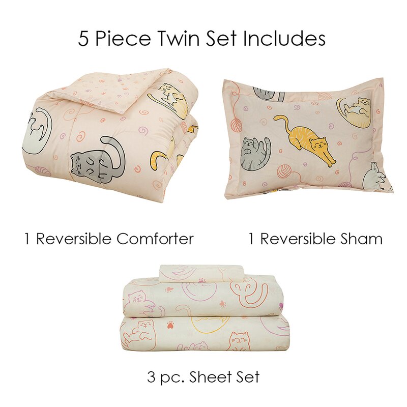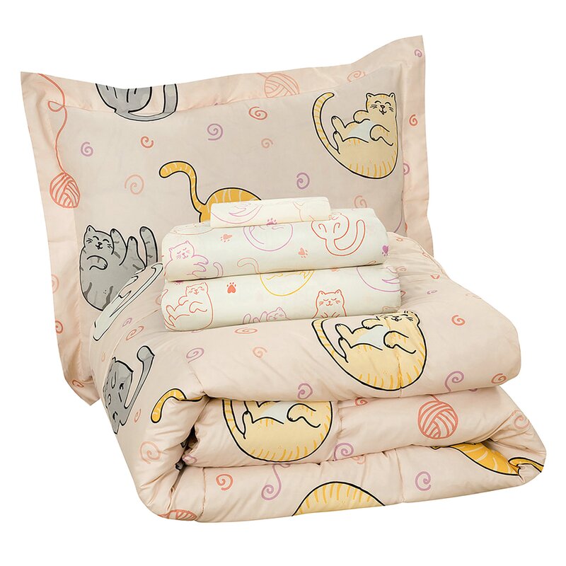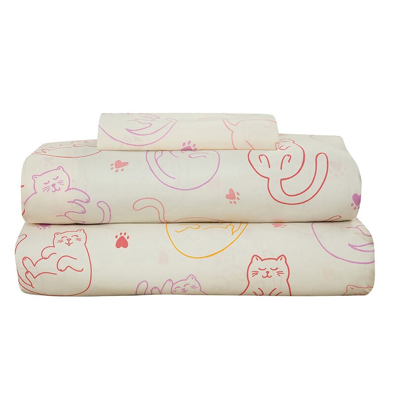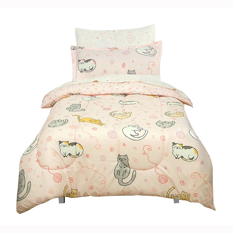This playful bedding set is made to get your child excited for bedtime. This set is made from cozy polyester microfiber and includes a comforter, shams, pillowcases, and sheets. It features a whimsical pattern of gray, white, and tan sleeping cats with pink and purple yarn balls on a soft pink background. It even reverses to a pawprint and yarn pattern in pink and purple, so you get the look of two different patterns with the convenience of one comforter. This set includes a white sheet set with a colorful cat print in coordinating colors. Plus, upkeep is easy: it’s machine washable and resistant to fading, wrinkles, and pilling.