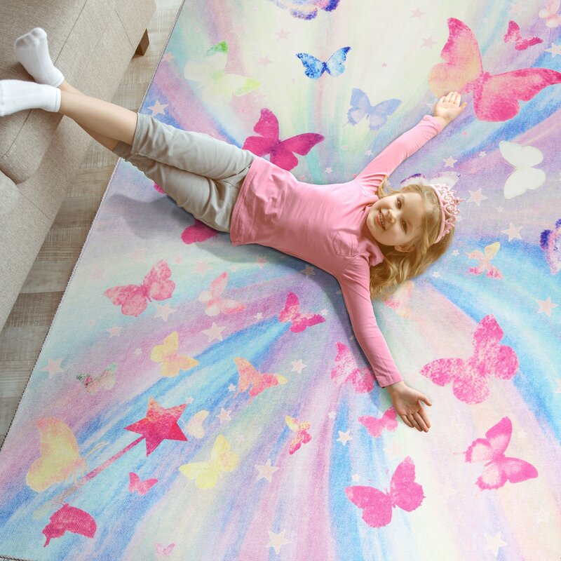 Create a delightful centerpiece in your family-friendly room with the Butterfly Colorful Kids Indoor Area Rug. Complete the classic look of your playroom with this exciting home accent. The Polyester construction is incredibly durable, while being soft and comfortable. This beautiful area rug can handle the most frequented indoor areas of your home, including the kitchen, family room, basement, and entryway. This rug is a long-lasting and durable option for homes with children and pets.