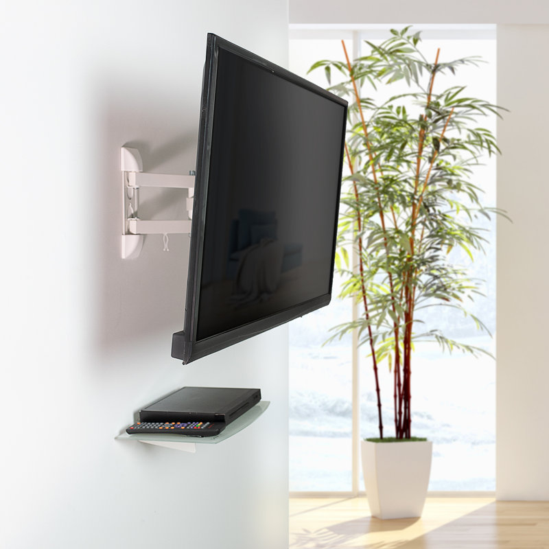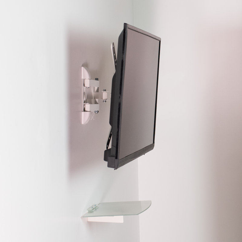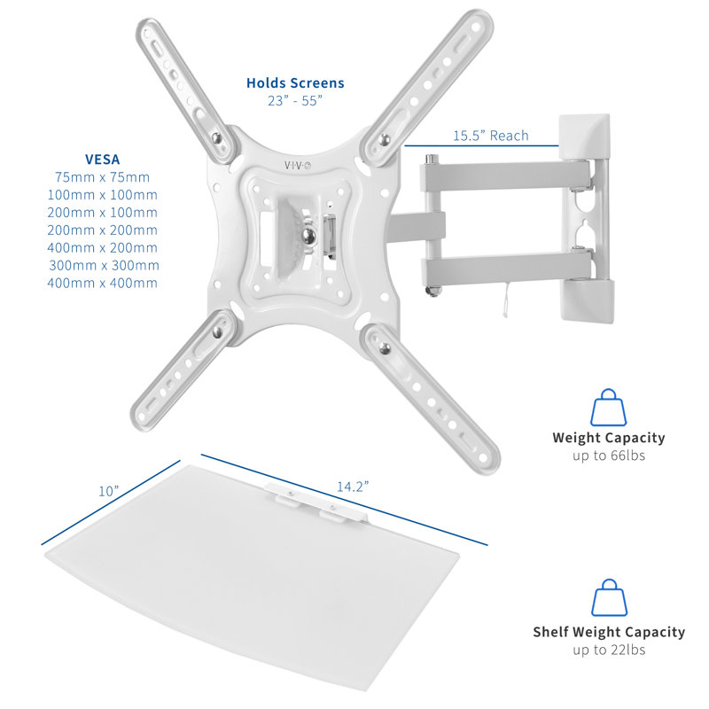 MOUNT-VWSF1W is a white flat screen wall mount and tempered glass shelf combination from VIVO conveniently mounting your TV and providing easy placement for AV equipment. This high-grade steel mount has a weight capacity of 66 pounds and holds TV sizes 23″ to 55″. Features include +20 to -20 degree screen tilt and +90 to -90 degree TV swivel for creating best viewing angles and a cable management system to hold power and video cords. The arms collapse flat sitting just 3.5″ from the wall for a low profile, and can be extended 15.5″ from the wall. The mounting bracket is compatible with most TV brands and fits VESA 75x75mm, 100x100mm, 200x100mm and 200x200mm, 400x200mm, 300x300mm, and 400x400mm. Assembly and mounting is a breeze and we include necessary mounting hardware. The 14.2″ x 10″ shelf is made of strong 5mm tempered glass with a weight capacity of 22 lbs.