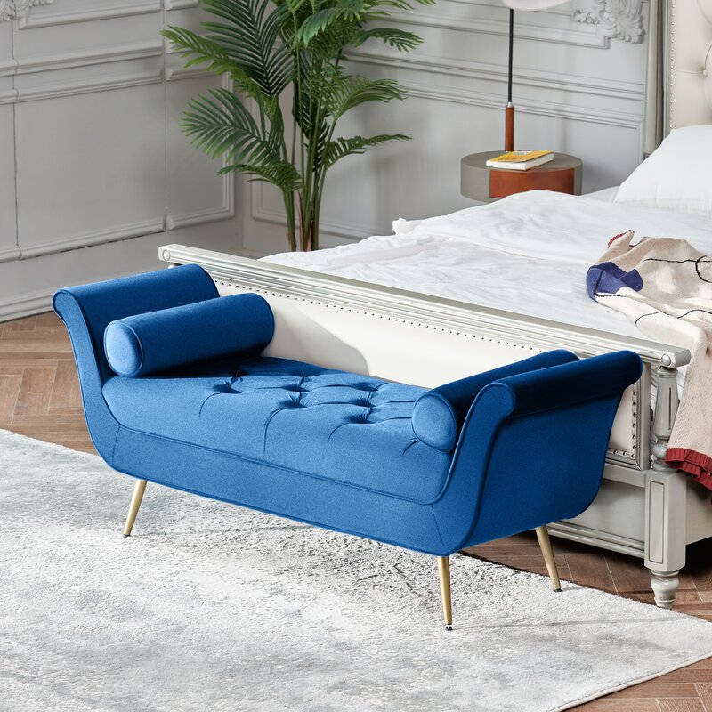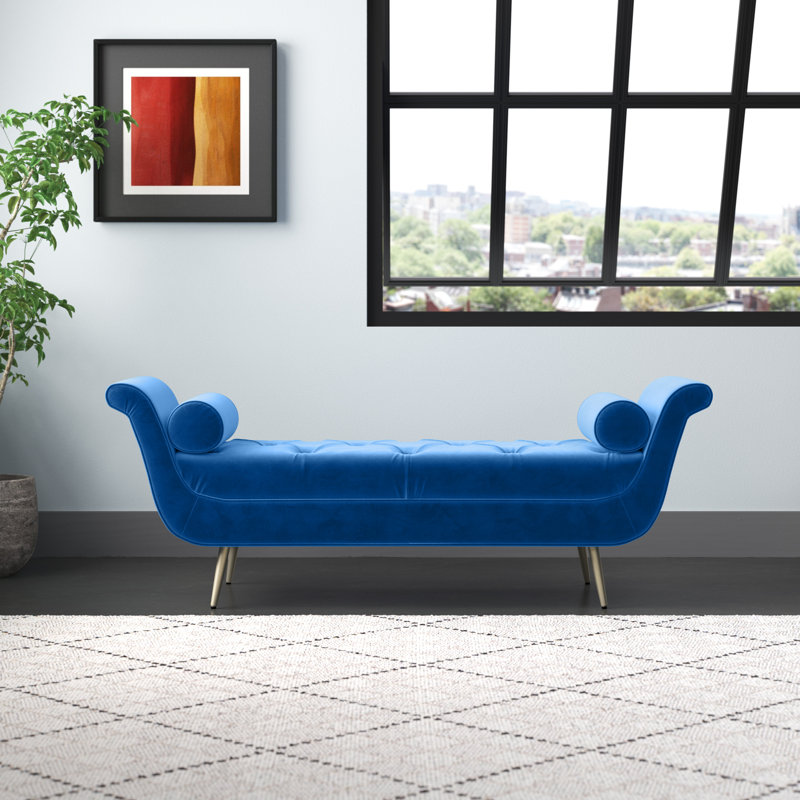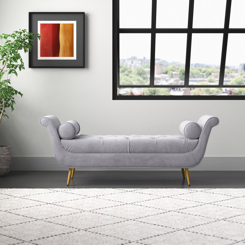 This bench completes your glam bedroom or entryway with an elegant, cradled design. It’s crafted with an engineered wood frame with sloping rolled arms on either end for a refined look. The cushion is filled with foam and upholstered in a luxe velvet for a smooth look and feel. We love the tapered, flared feet inspired by mid-century modern style. Button tufting and two included bolster pillows add the finishing touch of flair to this bench.