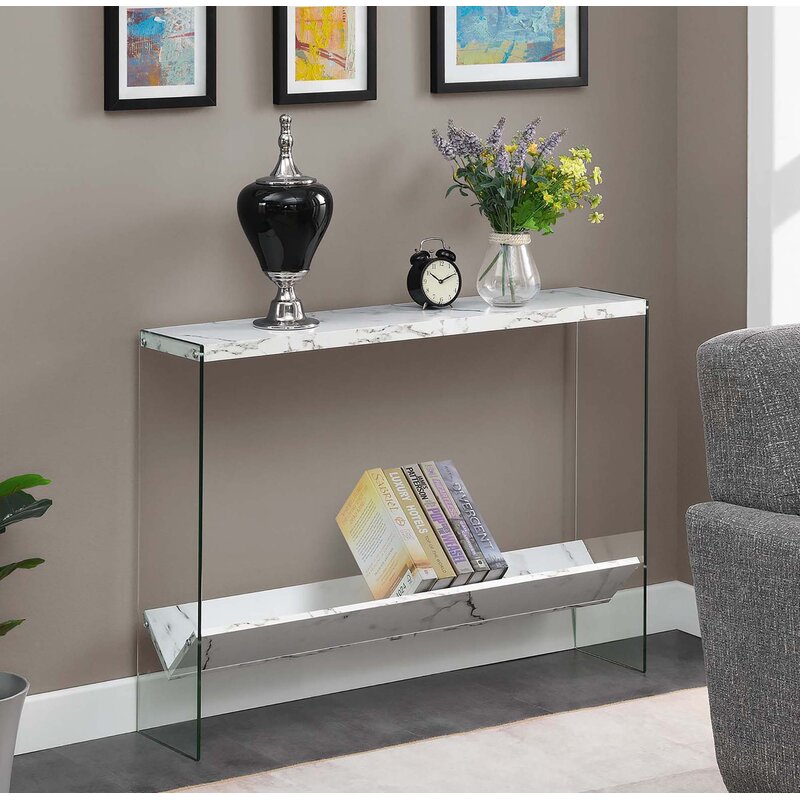 This console table updates your space with a sleek, modern look and extra storage. It has a top surface and V-shaped shelf both crafted from engineered wood with a rectangular silhouette. The design features two transparent, tempered glass side panels that support shelves, giving them an almost floating appearance. We love that it measures 42” wide and only 9.25” deep, so there’s plenty of tabletop top space for books, picture frames, and decor, but it doesn’t take up much floor space.