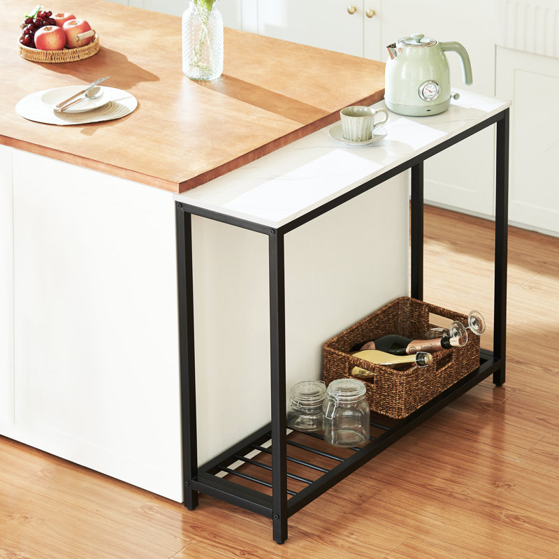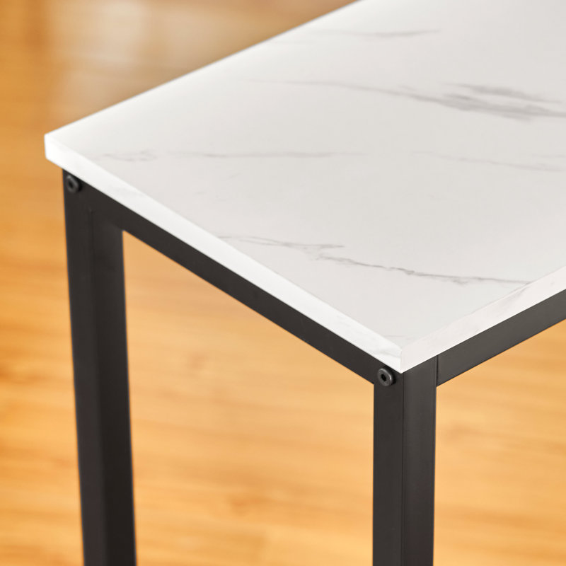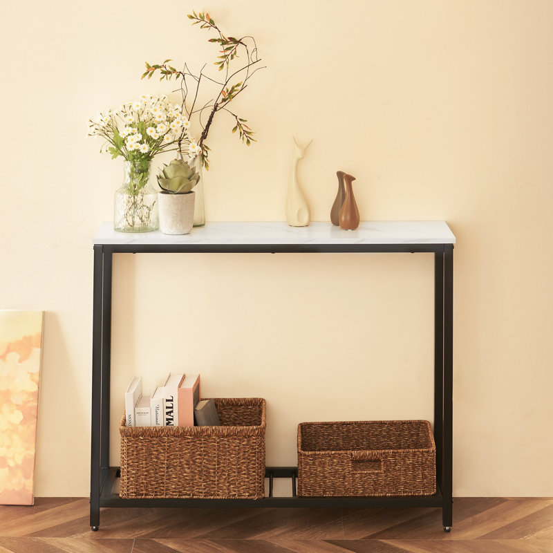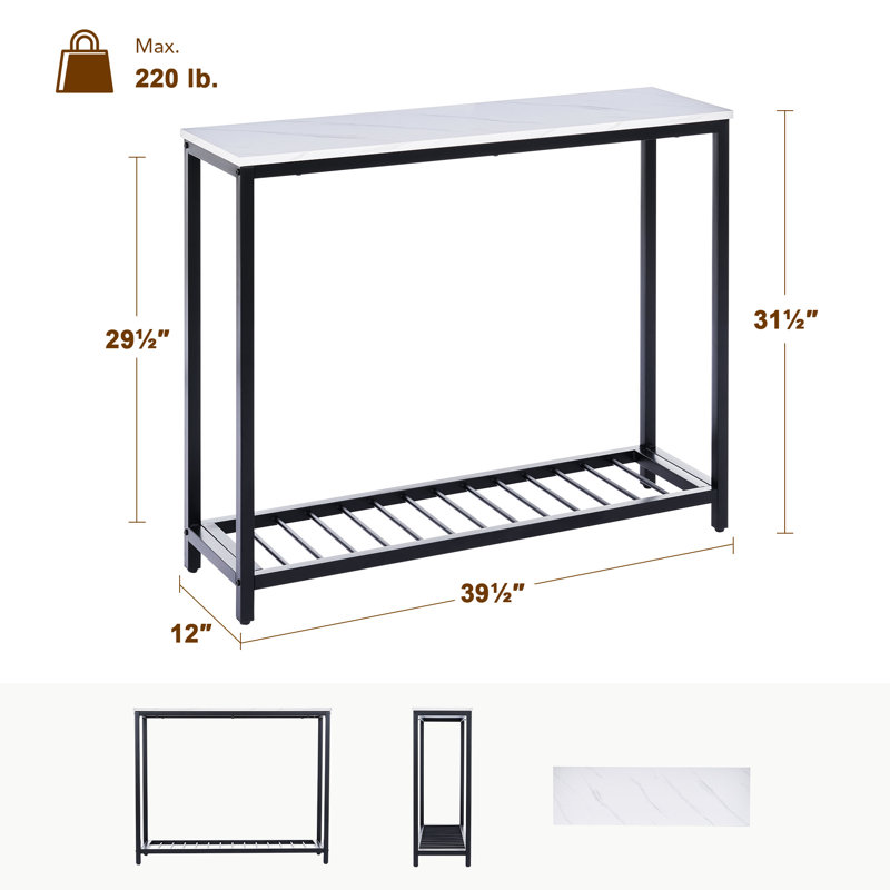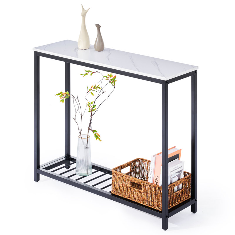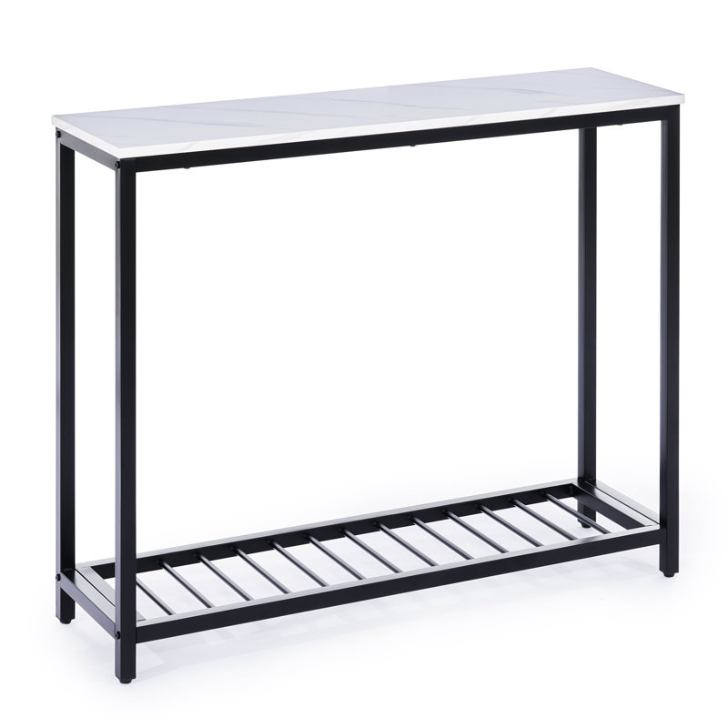 Contemporary and refined, this 39” console table brings subtle glam style to your entryway or living room. Made with steel, this piece features a versatile silhouette with sleek, straight legs and a matte black finish that’s easy to pair with colorful accents. A rectangular tabletop of engineered wood shows off a faux marble finish and offers a space to display your favorite items or photos. Plus, it has a low-slatted shelf that’s great for storage baskets or even for storing your shoes. At just 12” deep, it’s just right for placing against the back of your sofa.