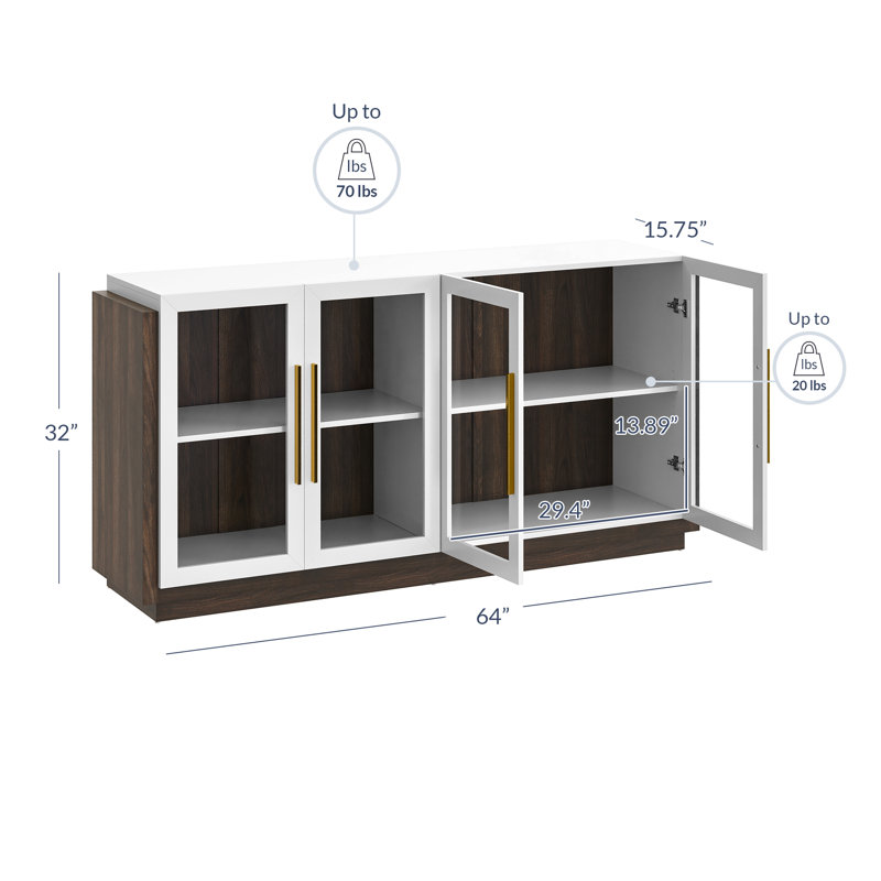 Elevate the look of your dining room with this 64†wide sideboard. We love its clean, streamlined silhouette that complements a contemporary or transitional design aesthetic. It also has a place in your living room or foyer as a console or entertainment unit. It is made from engineered wood with a rich dark finish that highlights the grain variation for some visual dimension. The four cabinet doors have clear glass fronts and inside are a total of eight shelves – four fixed and four adjustable. The vertical metal pulls add a distinctive contrast. Top with decor or use as a coffee and dessert station when entertaining a crowd. Assembly is required.