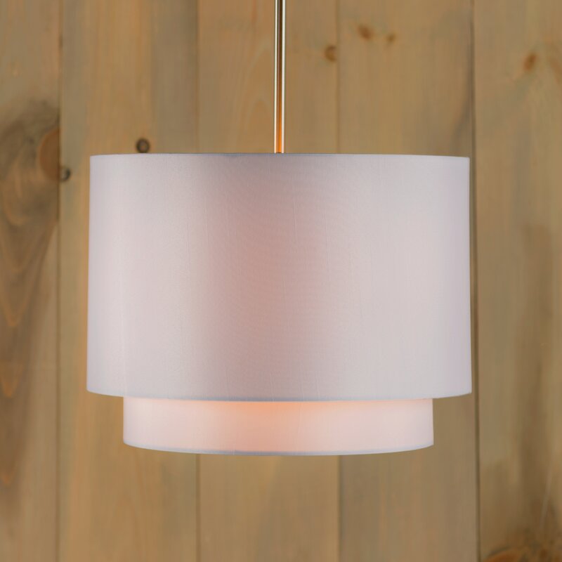 Our 3-light, 15-Inch diameter indoor pendant fixture offers a double-stacked cylindrical drum shade design and can be adjusted in height to be used as a semi-flush ceiling light too. Included are a sleek, single metal down rod, a matching ceiling canopy, and all installation components. A frosted acrylic lens at the base of this fixture diffuses the light. This indoor pendant can be used as a 1-light source over a focal point such as a kitchen table, den, island, counter, dining area, bar, bedroom nightstand, or reading space.