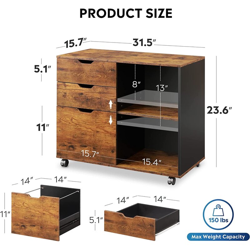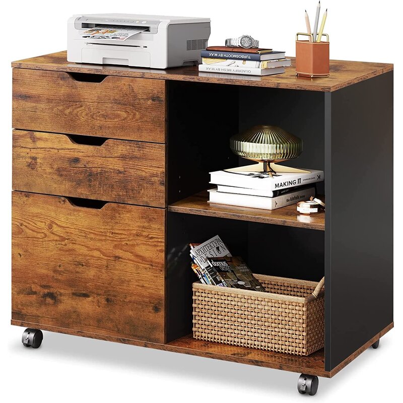 An ideal deskmate, this lateral print stand provides additional storage space and a modern look to your home office setup. Its clean-lined frame is made from engineered wood. Three drawers with cutout handles are just right for tucking away office supplies and files. Two open and adjustable shelves provide space for baskets and books. We love that there’s room on the surface for your printer. Plus, this stand is supported by four wheels that have built-in brakes to help keep it in position.