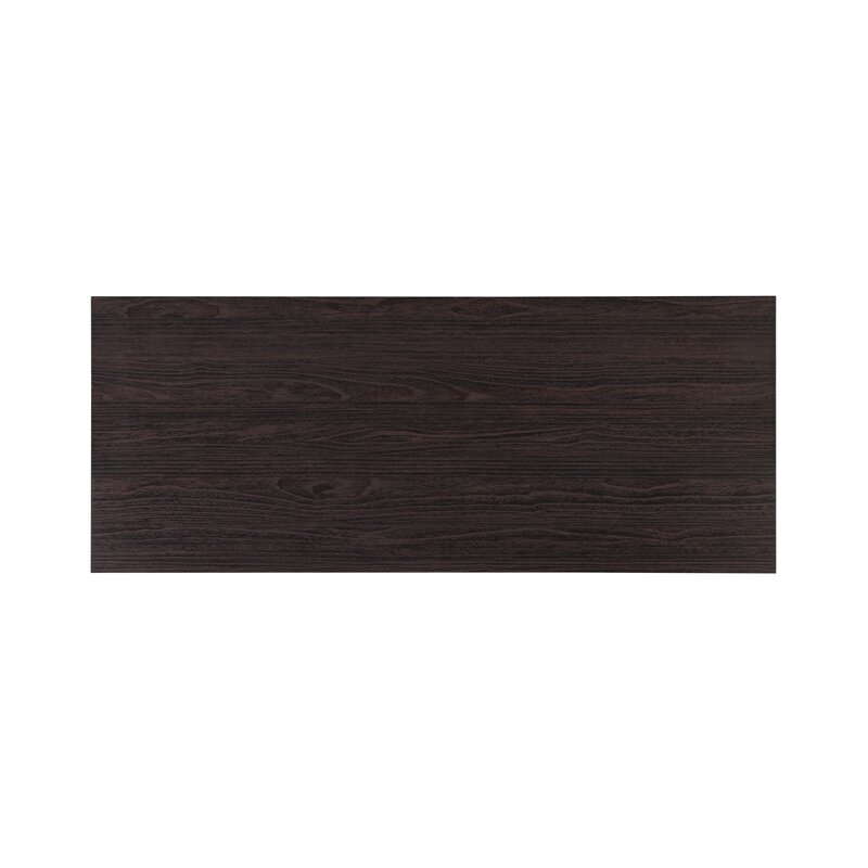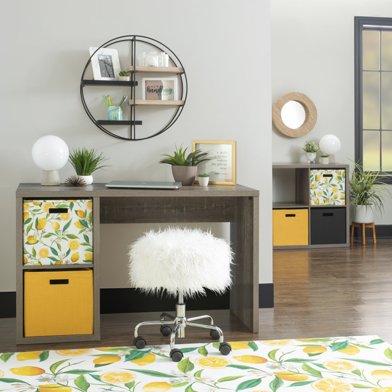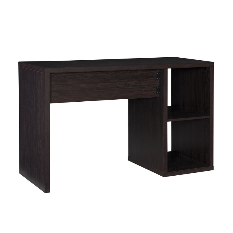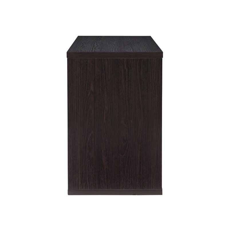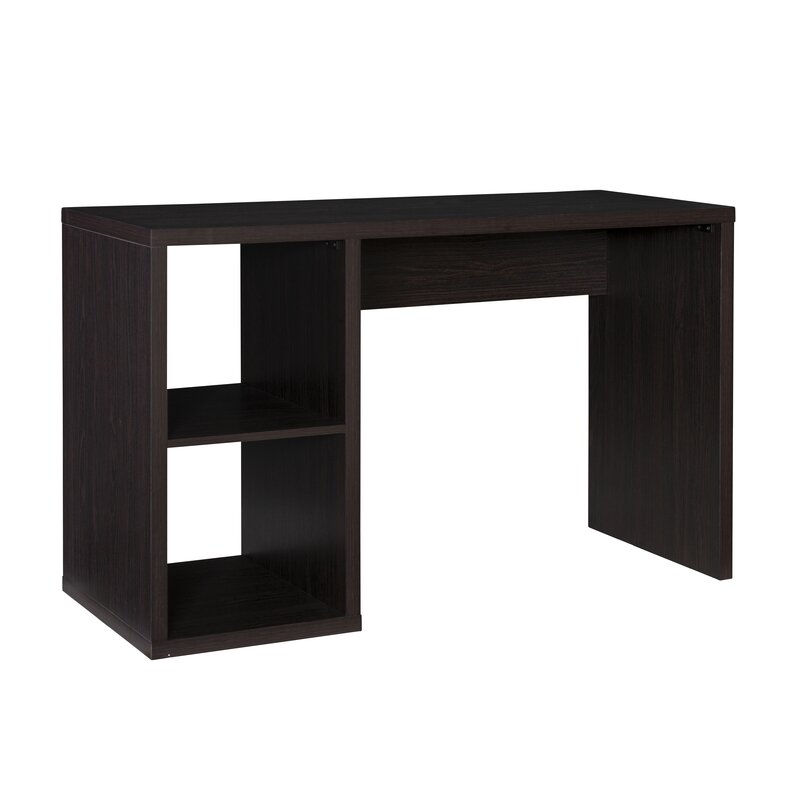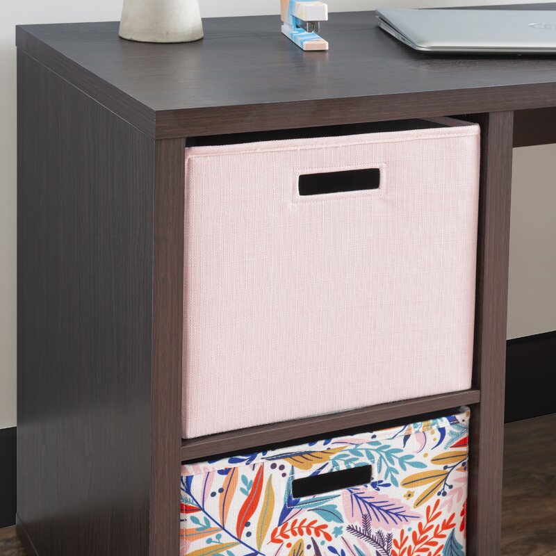 This writing table has a simple design and offers a lot of storage for the things you want to tuck out of sight. It is made of engineered wood with a dark finish. The generously-sized rectangular work surface provides ample room for your laptop or full-sized desktop computer, mouse/mouse pad, and paperwork. Two side cubbies are sized to hold fabric bins (sold separately) that add a pop of color or texture. Or, simply use them as shelves for books or files. This writing desk has a finished back, so is usable as a room divider.